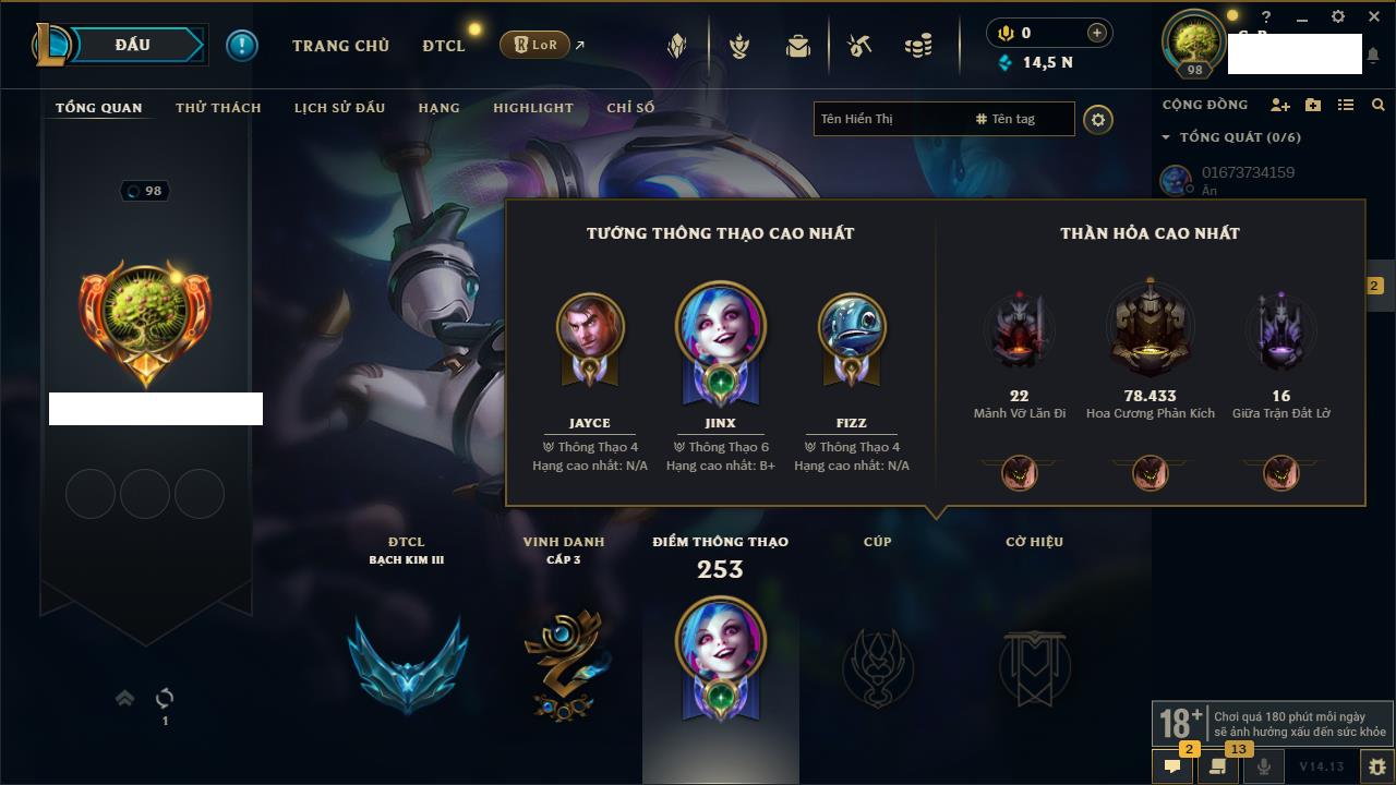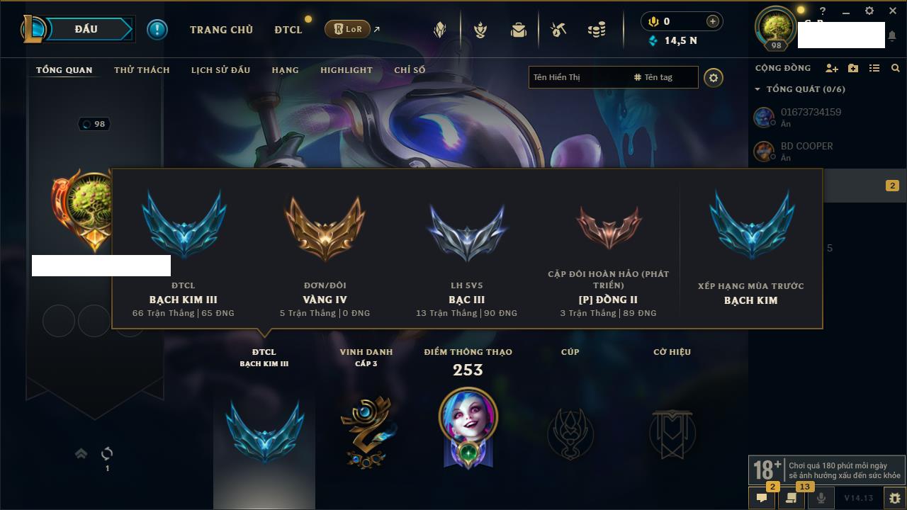 Rank Đơn: Bạch Kim IIKhung: Bạch kimTướng: 171 - Còn 141298 THXTrang Phục: 274Rank ĐTCL: Bạch Kim IILinh Thú: 188