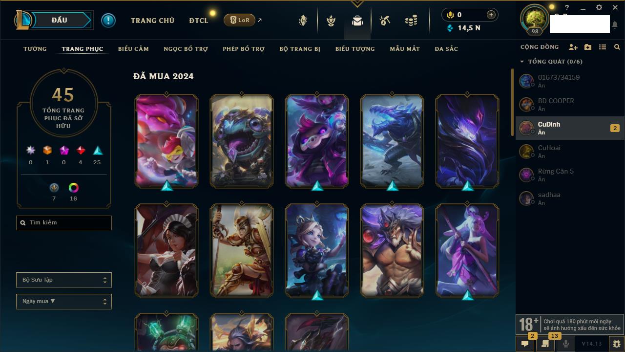 Rank Đơn: Vàng IIIKhung: VàngTướng: 171 - Còn 88128 THXTrang Phục: 329Rank ĐTCL: Chưa RankLinh Thú: 41