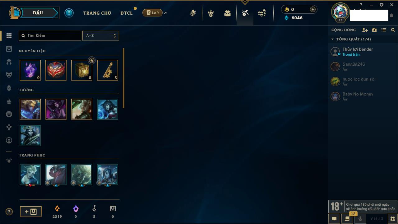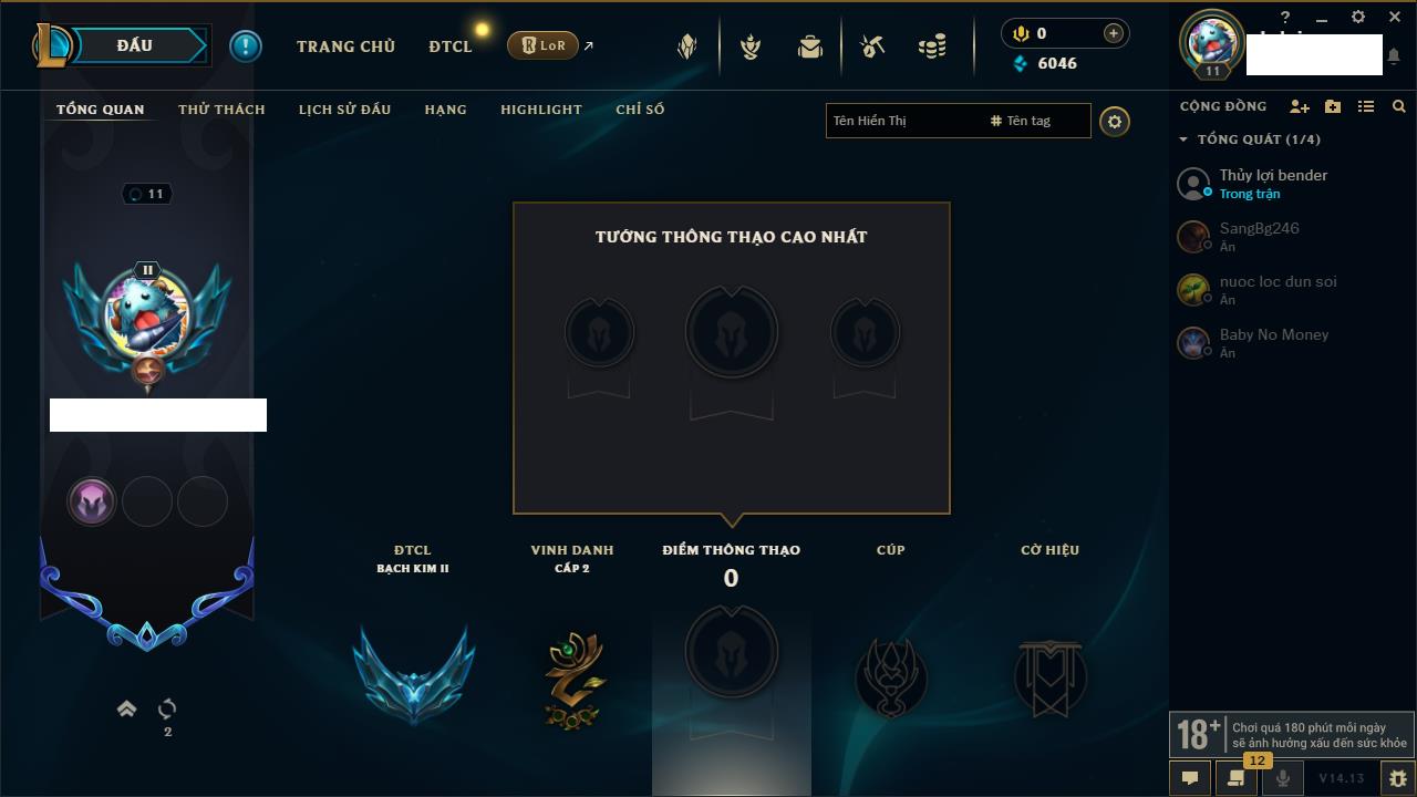 Rank Đơn: Chưa RankKhung: Chưa có khungTướng: 165 - Còn 3214 THXTrang Phục: 160Rank ĐTCL: Chưa RankLinh Thú: 28