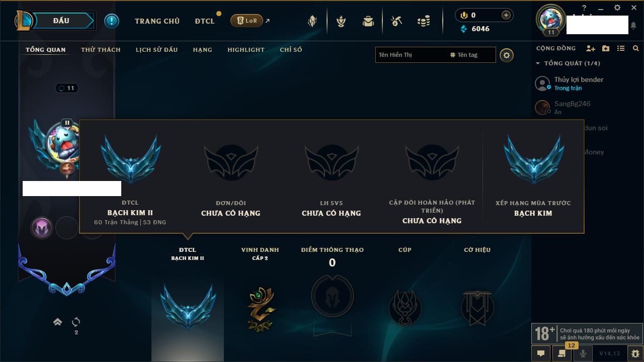 Rank Đơn: Chưa RankKhung: Chưa có khungTướng: 118 - Còn 13712 THXTrang Phục: 117Rank ĐTCL: Chưa RankLinh Thú: 34