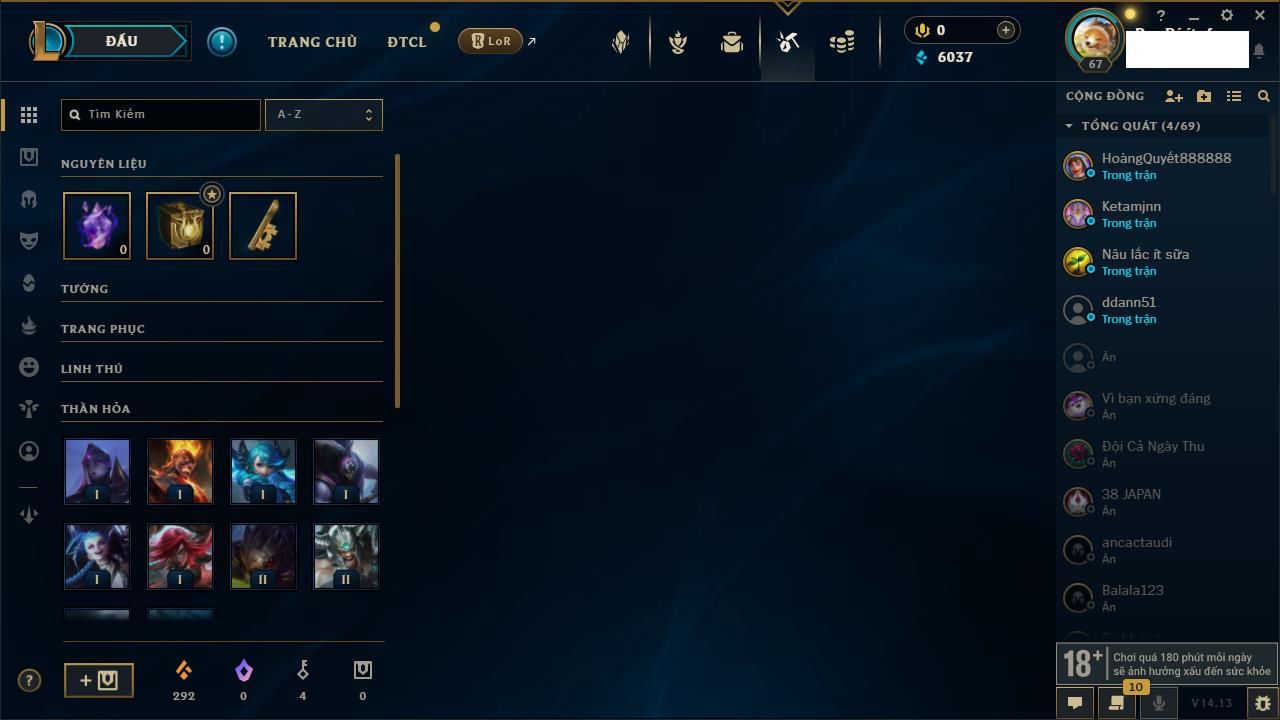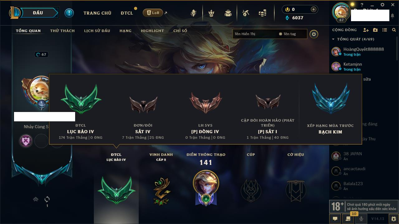 Rank Đơn: Chưa RankKhung: Chưa có khungTướng: 37 - Còn 27387 THXTrang Phục: 10Rank ĐTCL: Chưa RankLinh Thú: 1