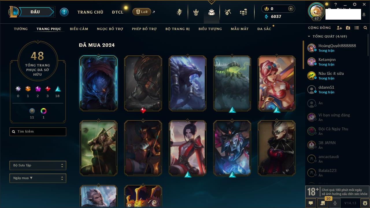 Rank Đơn: Chưa RankKhung: Chưa có khungTướng: 118 - Còn 13712 THXTrang Phục: 117Rank ĐTCL: Chưa RankLinh Thú: 34
