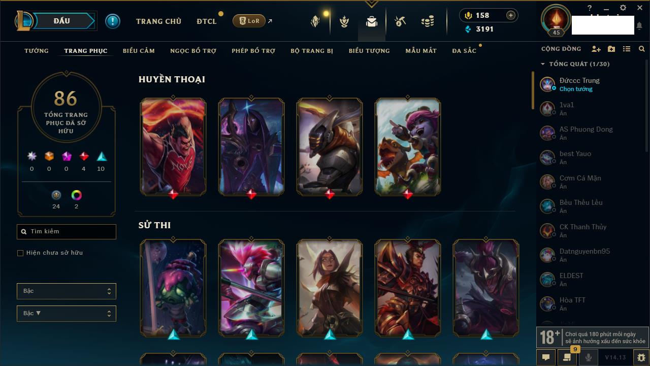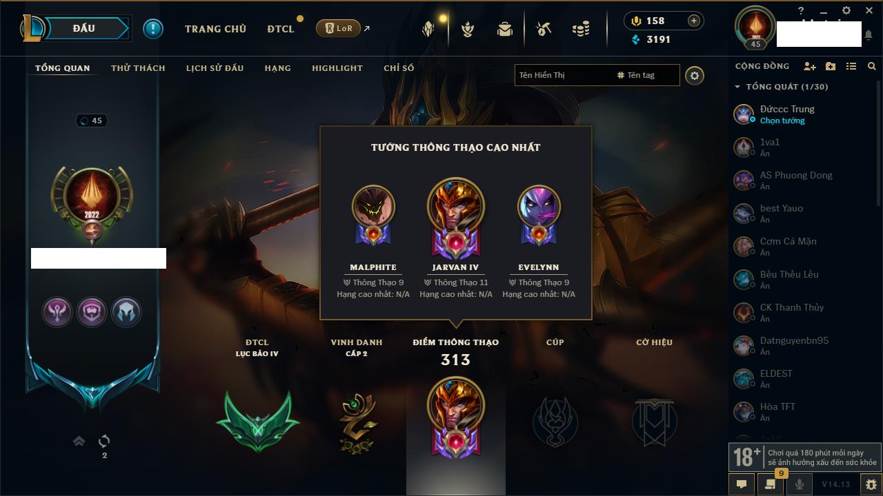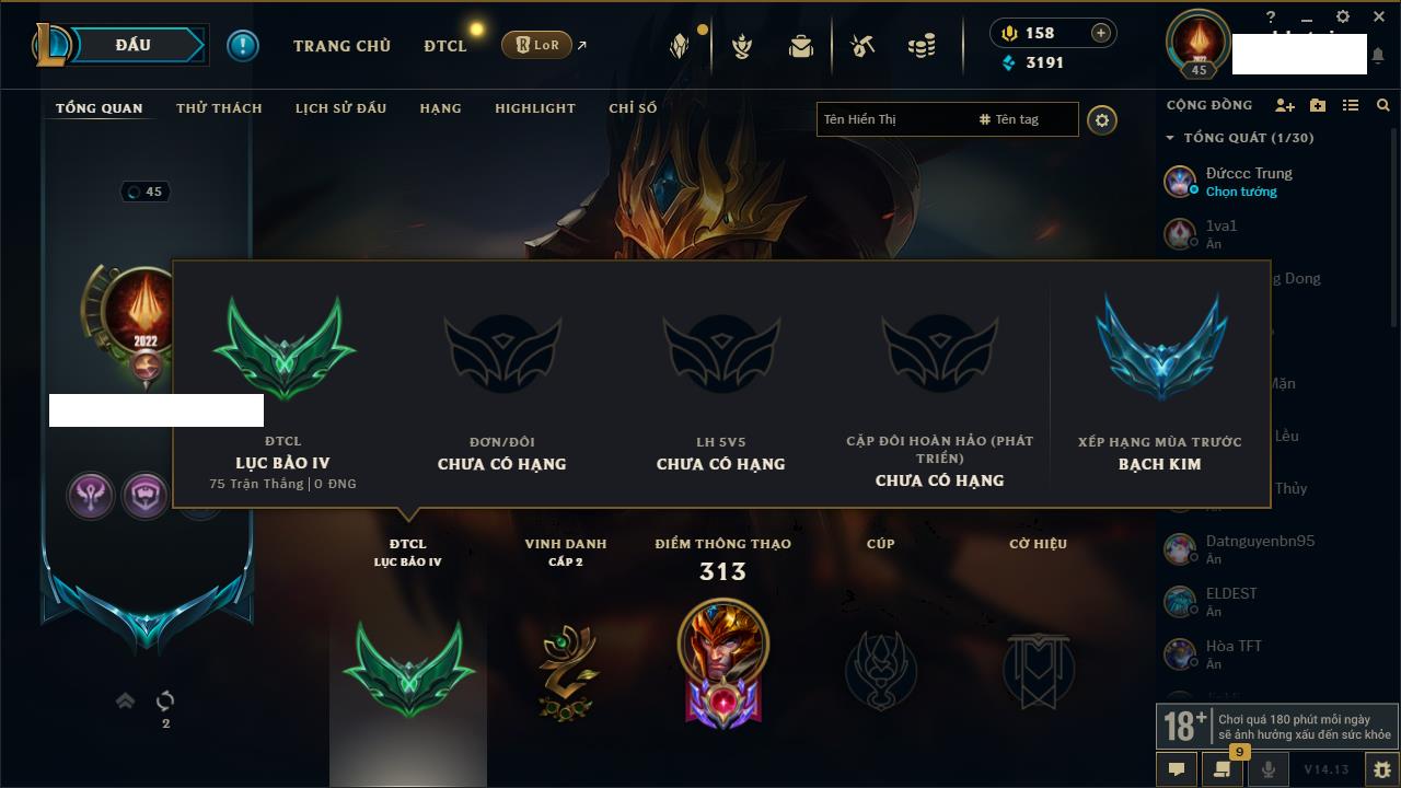 Rank Đơn: Vàng IKhung: BạcTướng: 171 - Còn 60584 THXTrang Phục: 286Rank ĐTCL: Vàng IIILinh Thú: 117