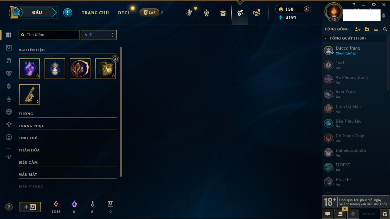 Rank Đơn: Bạch Kim IIIKhung: Bạch kimTướng: 171 - Còn 251383 THXTrang Phục: 229Rank ĐTCL: Sắt IILinh Thú: 51