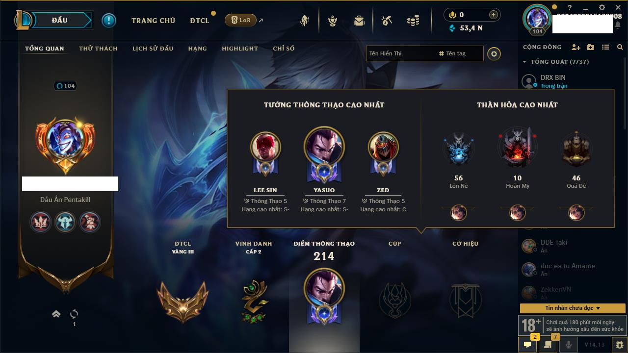 Rank Đơn: Vàng IVKhung: BạcTướng: 166 - Còn 180925 THXTrang Phục: 163Rank ĐTCL: Chưa RankLinh Thú: 67