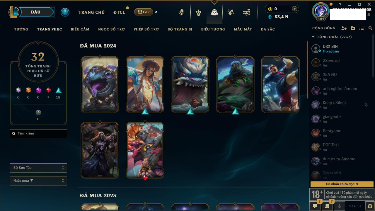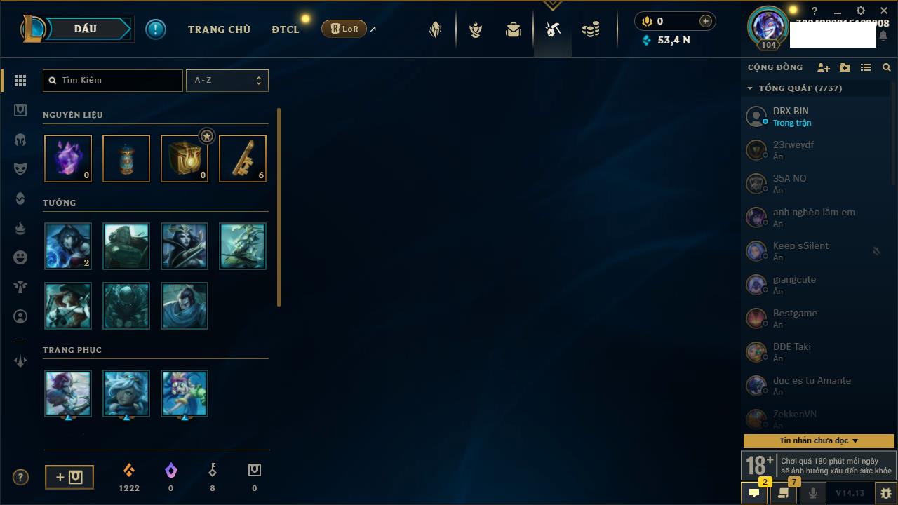 Rank Đơn: Vàng IVKhung: VàngTướng: 171 - Còn 48721 THXTrang Phục: 171Rank ĐTCL: Chưa RankLinh Thú: 27