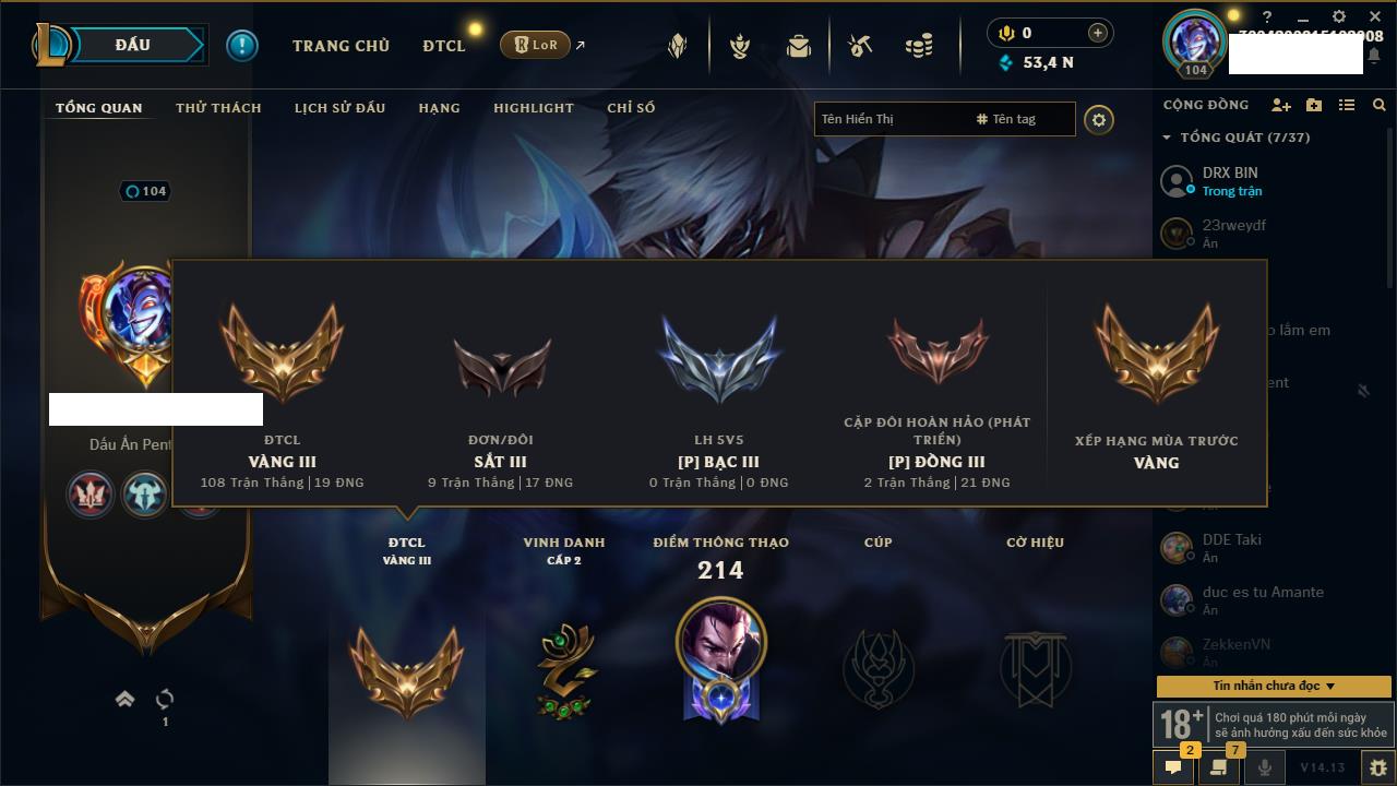 Rank Đơn: Bạc IIKhung: VàngTướng: 171 - Còn 332462 THXTrang Phục: 165Rank ĐTCL: Kim Cương IVLinh Thú: 181