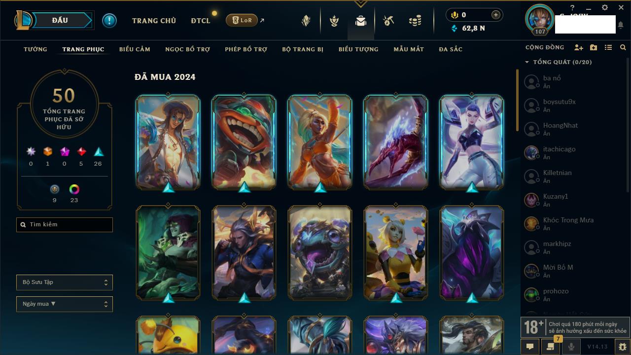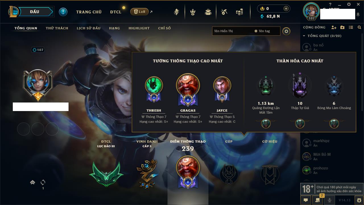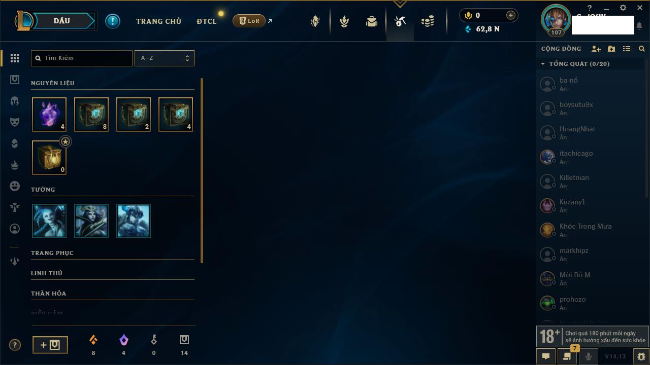 Rank Đơn: Đồng IIKhung: Chưa có khungTướng: 170 - Còn 56487 THXTrang Phục: 90Rank ĐTCL: Chưa RankLinh Thú: 129