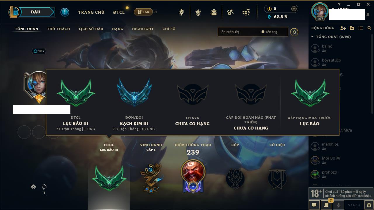 Rank Đơn: Đồng IIIKhung: ĐồngTướng: 171 - Còn 54778 THXTrang Phục: 96Rank ĐTCL: Bạch Kim IIILinh Thú: 140