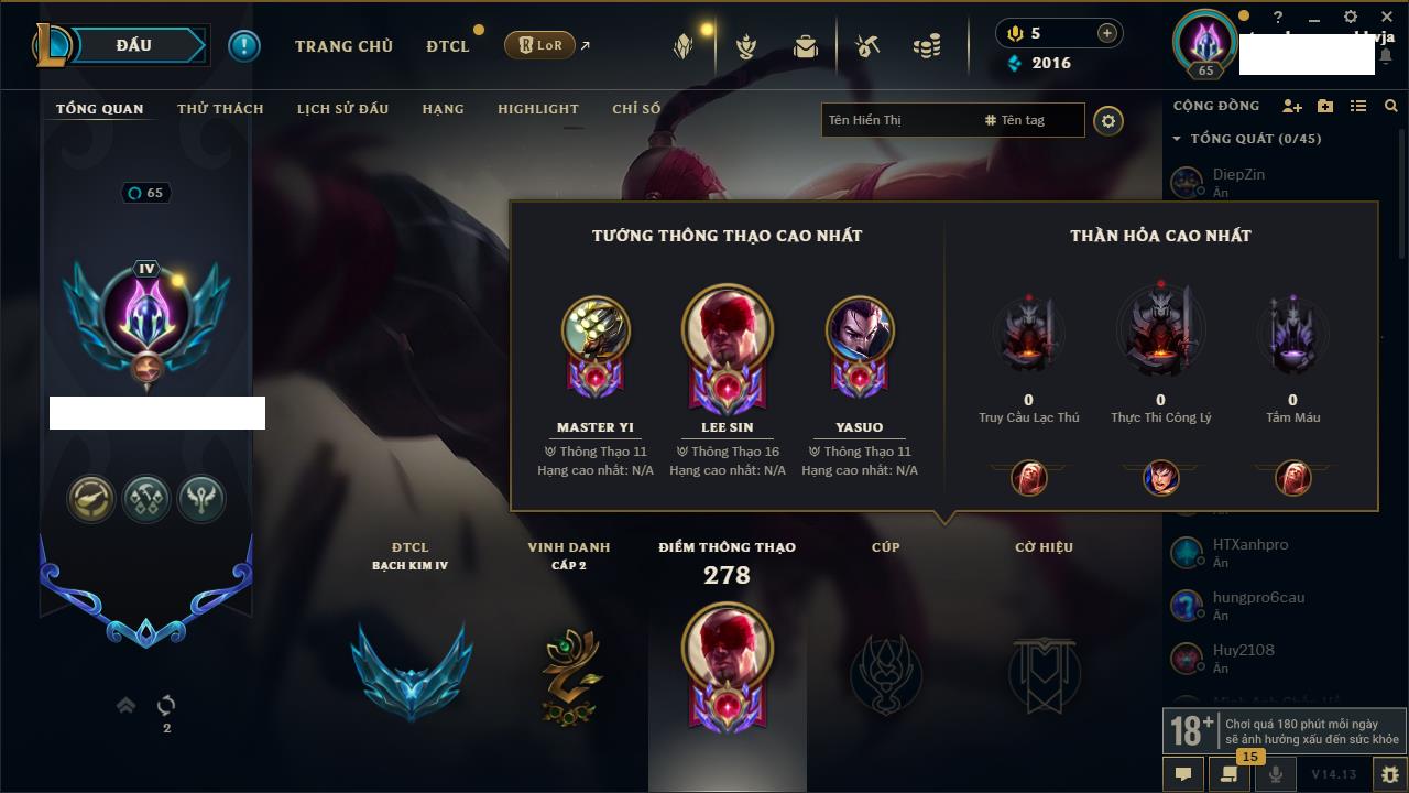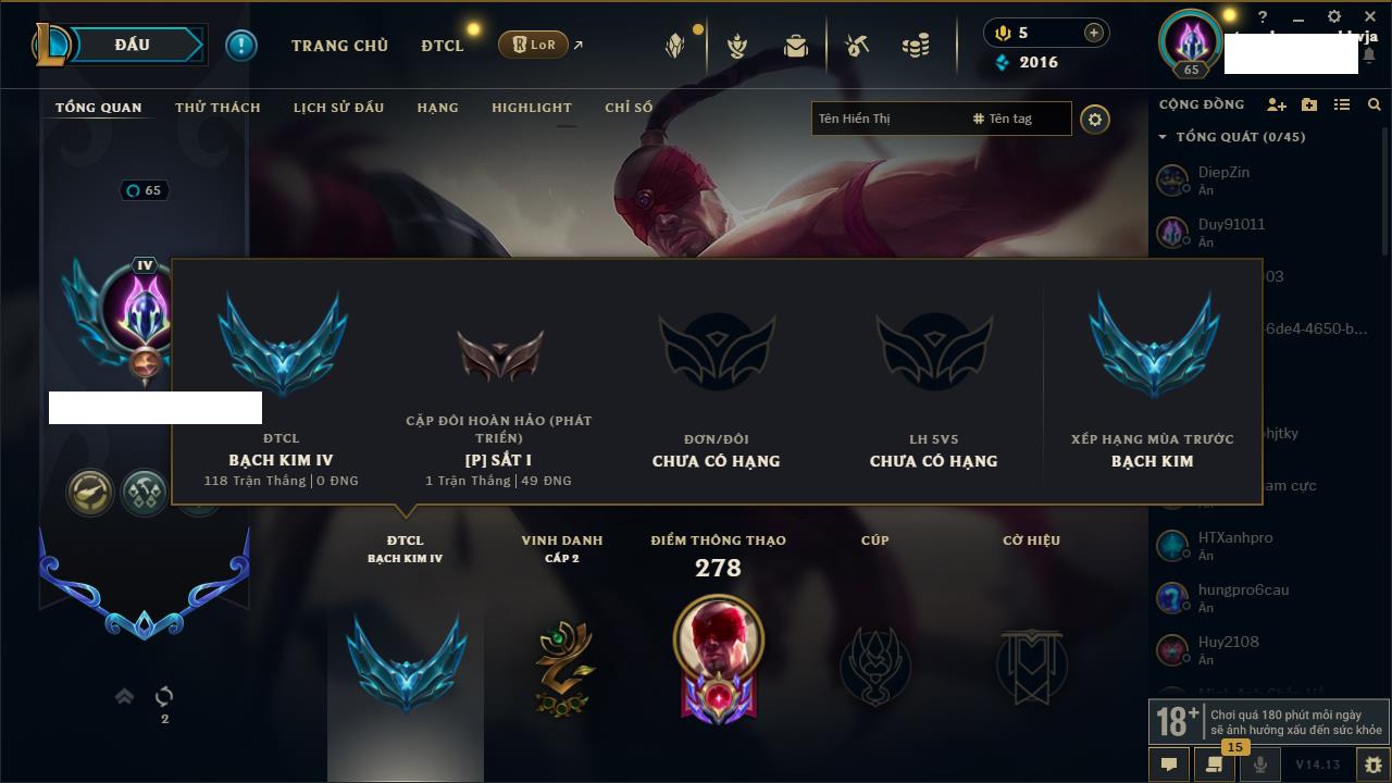Rank Đơn: Bạch Kim IVKhung: VàngTướng: 171 - Còn 130280 THXTrang Phục: 226Rank ĐTCL: Kim Cương IVLinh Thú: 183
