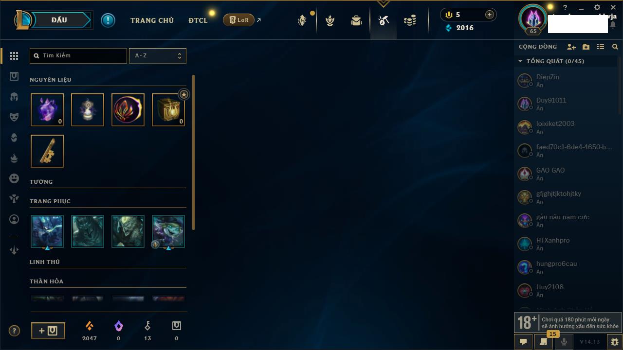 Rank Đơn: Vàng IIIKhung: Bạch kimTướng: 171 - Còn 98230 THXTrang Phục: 235Rank ĐTCL: Vàng IVLinh Thú: 59