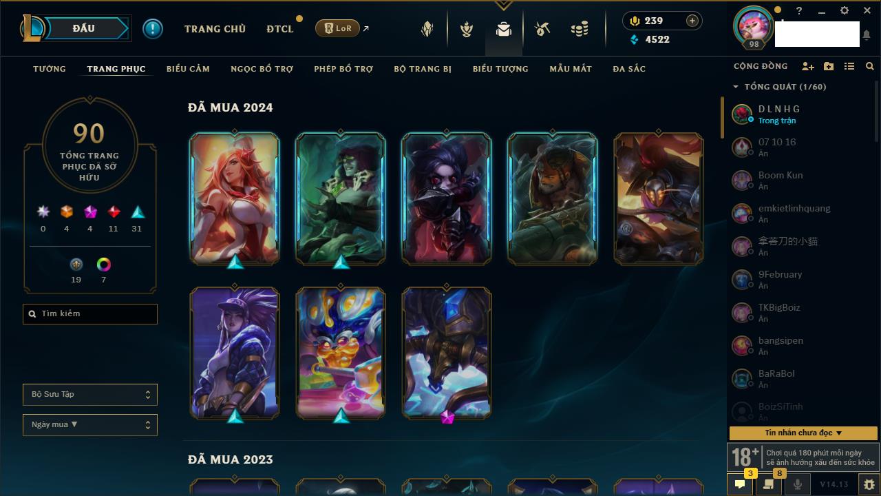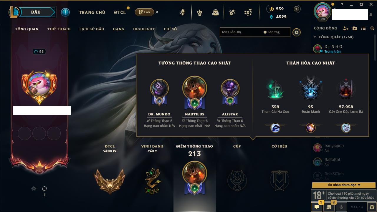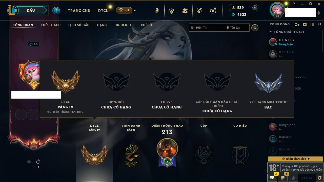 Rank Đơn: Bạch Kim IIKhung: Bạch kimTướng: 171 - Còn 315217 THXTrang Phục: 238Rank ĐTCL: Bạch Kim ILinh Thú: 116