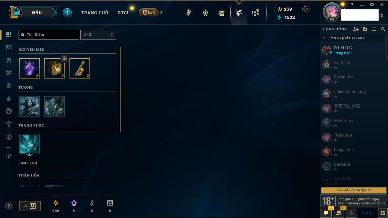 Rank Đơn: Lục Bảo IVKhung: VàngTướng: 171 - Còn 154648 THXTrang Phục: 203Rank ĐTCL: Bạch Kim IVLinh Thú: 69