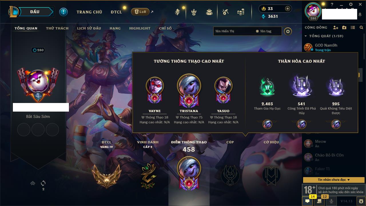 Rank Đơn: Bạch Kim IIIKhung: Bạch kimTướng: 170 - Còn 61079 THXTrang Phục: 352Rank ĐTCL: Sắt IILinh Thú: 70