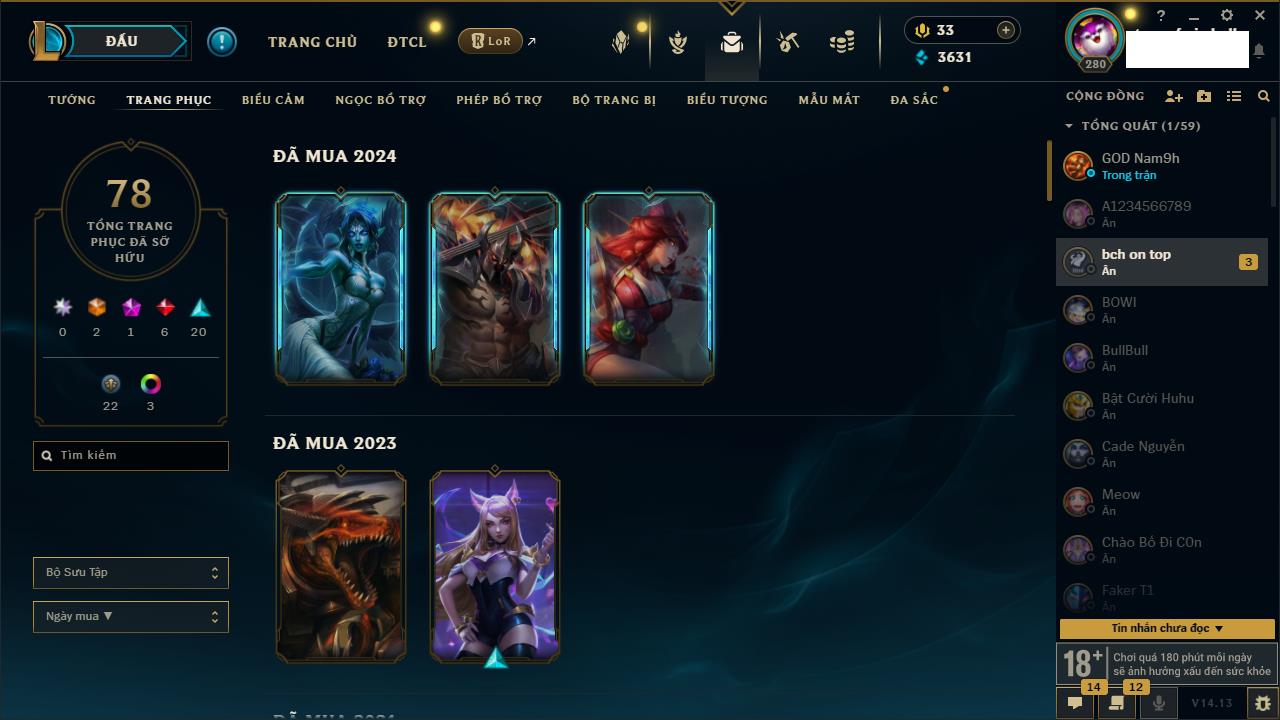 Rank Đơn: Đồng IIIKhung: ĐồngTướng: 170 - Còn 48082 THXTrang Phục: 272Rank ĐTCL: Chưa RankLinh Thú: 84