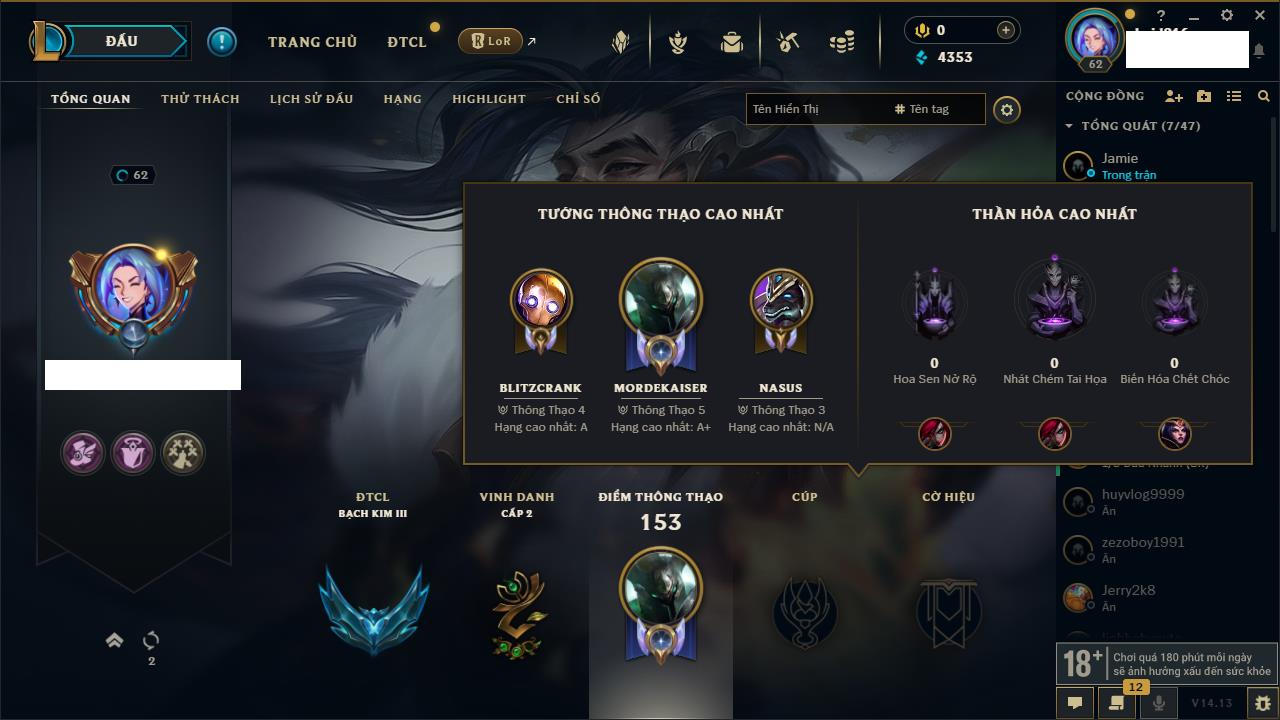 Rank Đơn: Chưa RankKhung: Chưa có khungTướng: 118 - Còn 13712 THXTrang Phục: 117Rank ĐTCL: Chưa RankLinh Thú: 34