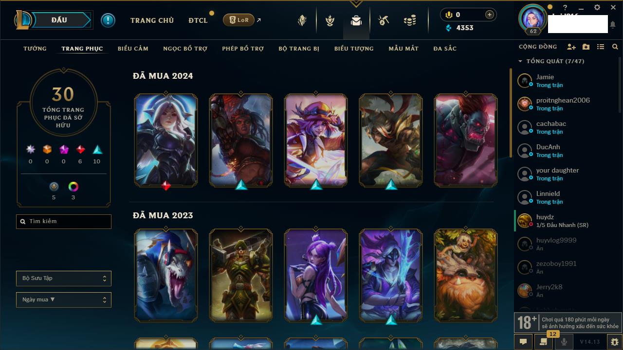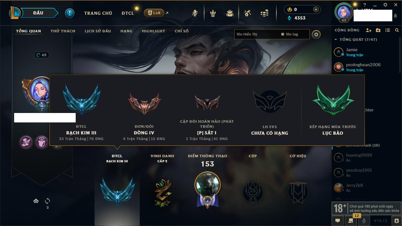 Rank Đơn: Chưa RankKhung: Chưa có khungTướng: 165 - Còn 3214 THXTrang Phục: 160Rank ĐTCL: Chưa RankLinh Thú: 28