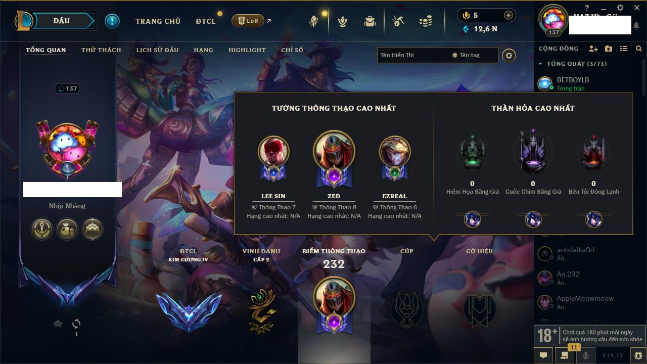 Rank Đơn: Chưa rank mùa nàoKhung: Chưa có khungTướng: 0 - Còn 2000 THXTrang Phục: 0Rank ĐTCL: Chưa RankLinh Thú: 14