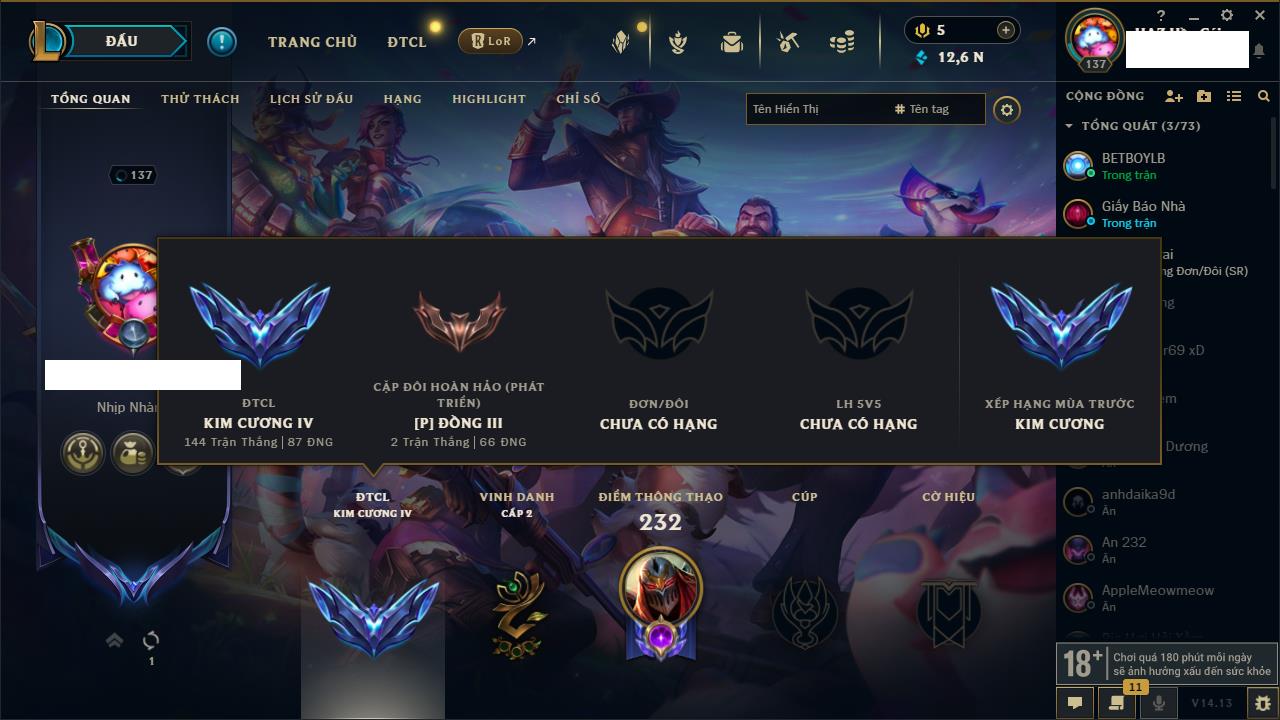 Rank Đơn: Chưa RankKhung: BạcTướng: 141 - Còn 299 THXTrang Phục: 101Rank ĐTCL: Chưa RankLinh Thú: 84