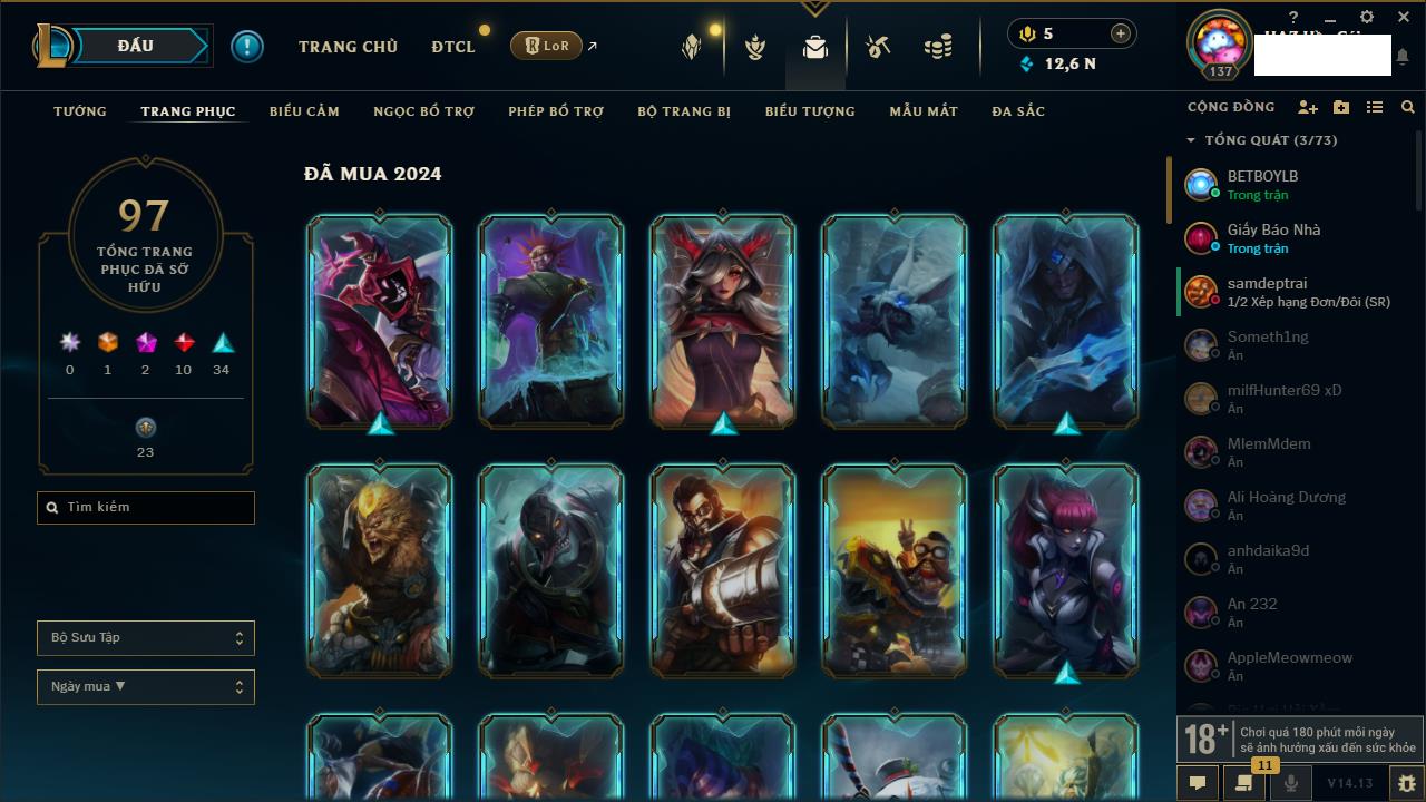 Rank Đơn: Chưa RankKhung: Chưa có khungTướng: 163 - Còn 157403 THXTrang Phục: 149Rank ĐTCL: Chưa RankLinh Thú: 122