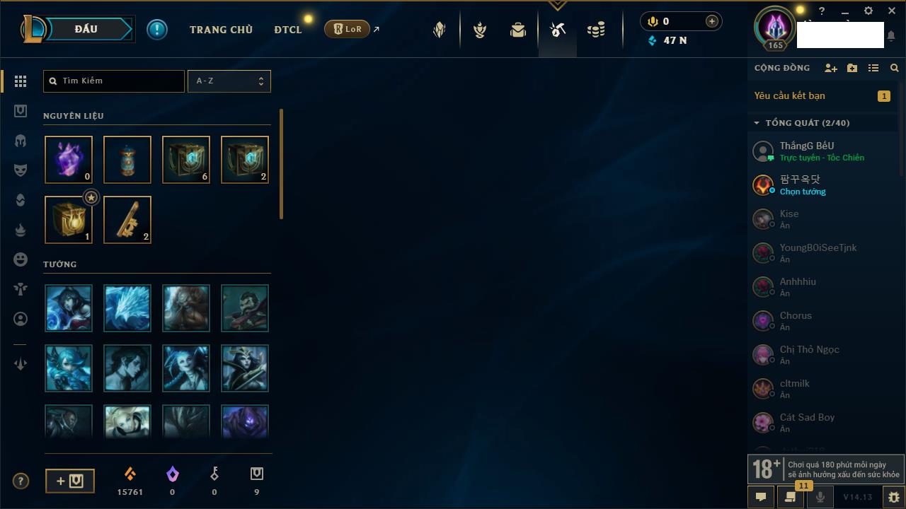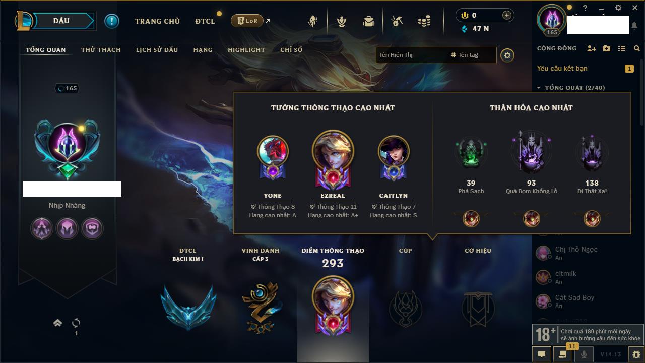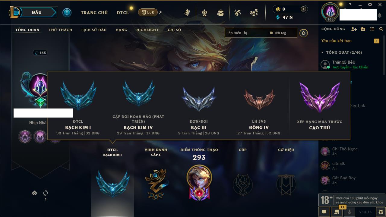 Rank Đơn: Vàng IIIKhung: BạcTướng: 171 - Còn 101359 THXTrang Phục: 88Rank ĐTCL: Kim Cương IVLinh Thú: 200