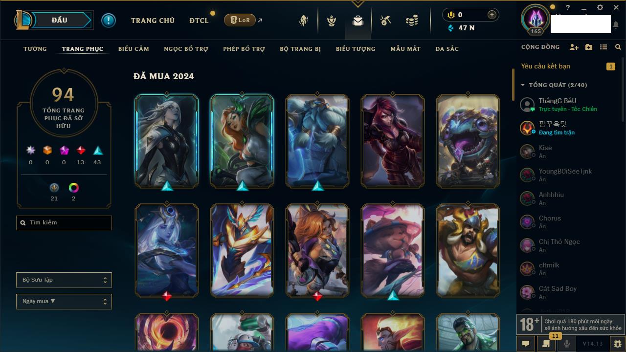 Rank Đơn: Lục Bảo IVKhung: Bạch kimTướng: 171 - Còn 128452 THXTrang Phục: 193Rank ĐTCL: Bạc IIILinh Thú: 100