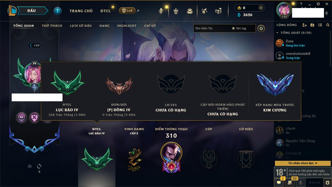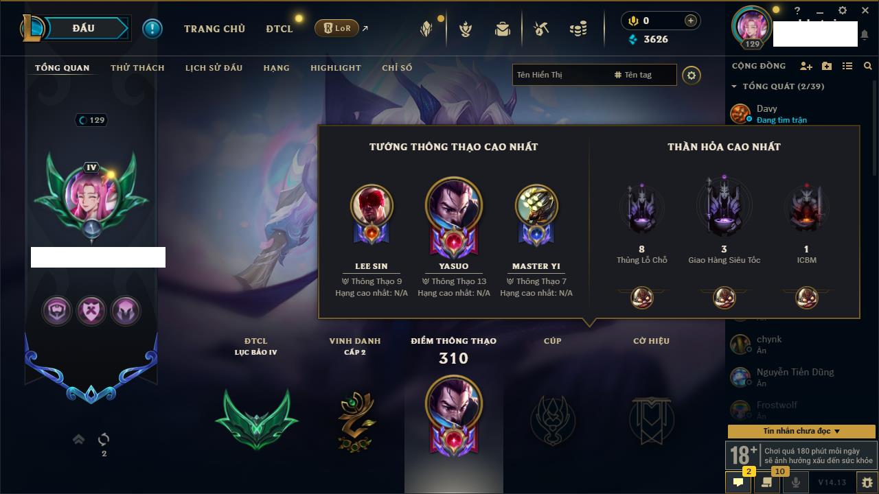 Rank Đơn: Vàng IVKhung: VàngTướng: 146 - Còn 89110 THXTrang Phục: 63Rank ĐTCL: Vàng IIILinh Thú: 41
