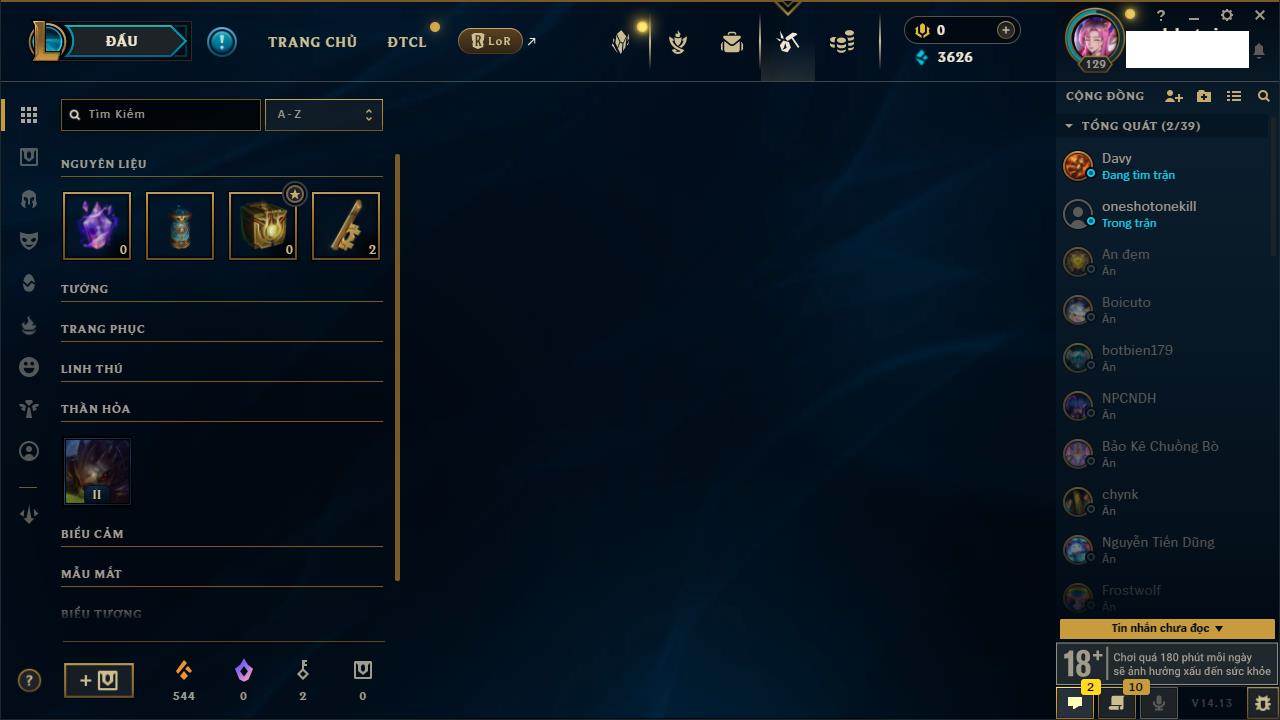 Rank Đơn: Đồng IIKhung: Chưa có khungTướng: 170 - Còn 56487 THXTrang Phục: 90Rank ĐTCL: Chưa RankLinh Thú: 129