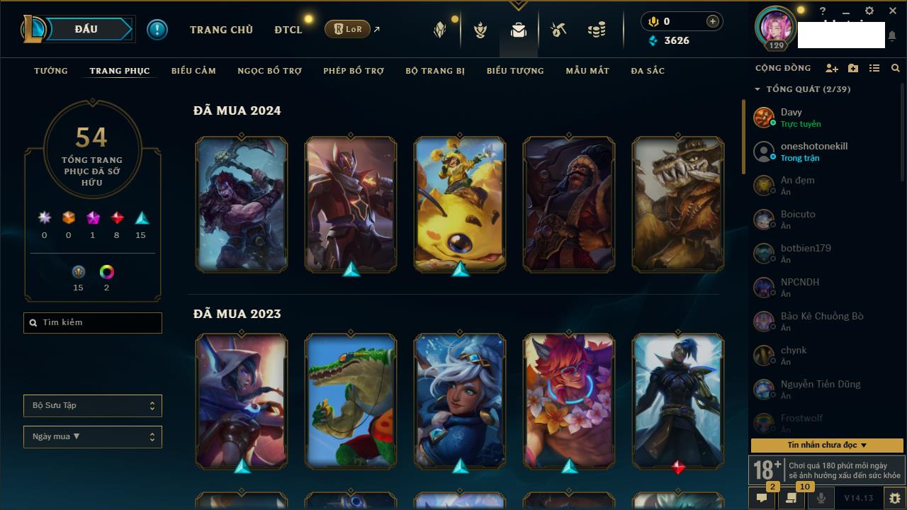 Rank Đơn: Vàng IIIKhung: VàngTướng: 170 - Còn 33222 THXTrang Phục: 136Rank ĐTCL: Chưa RankLinh Thú: 40