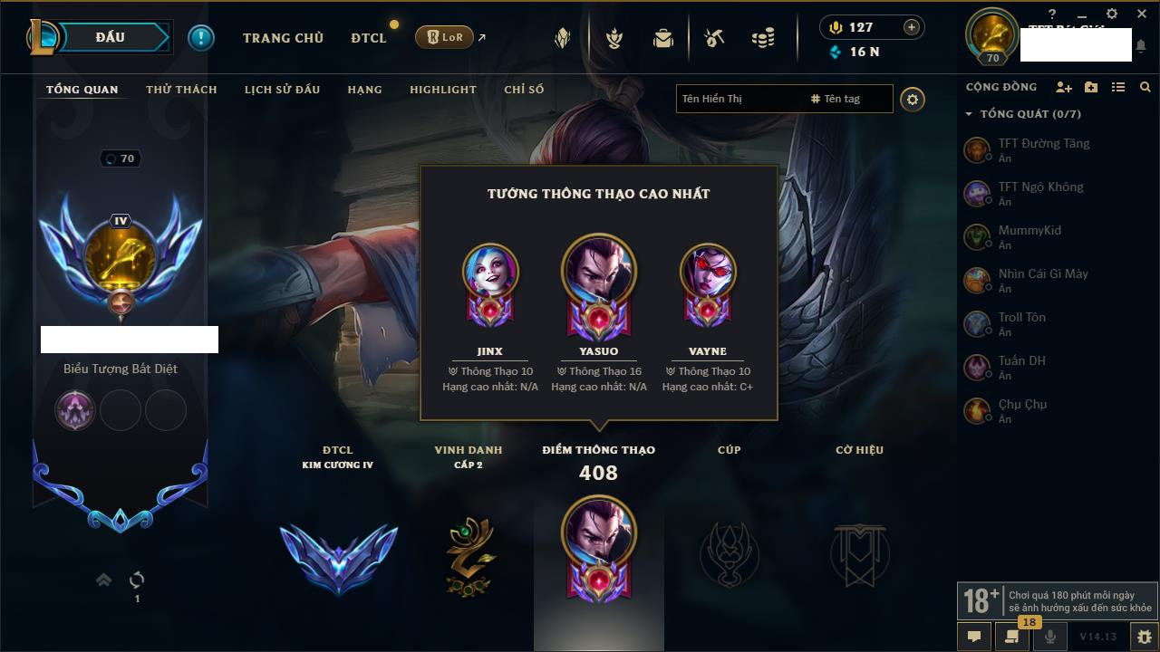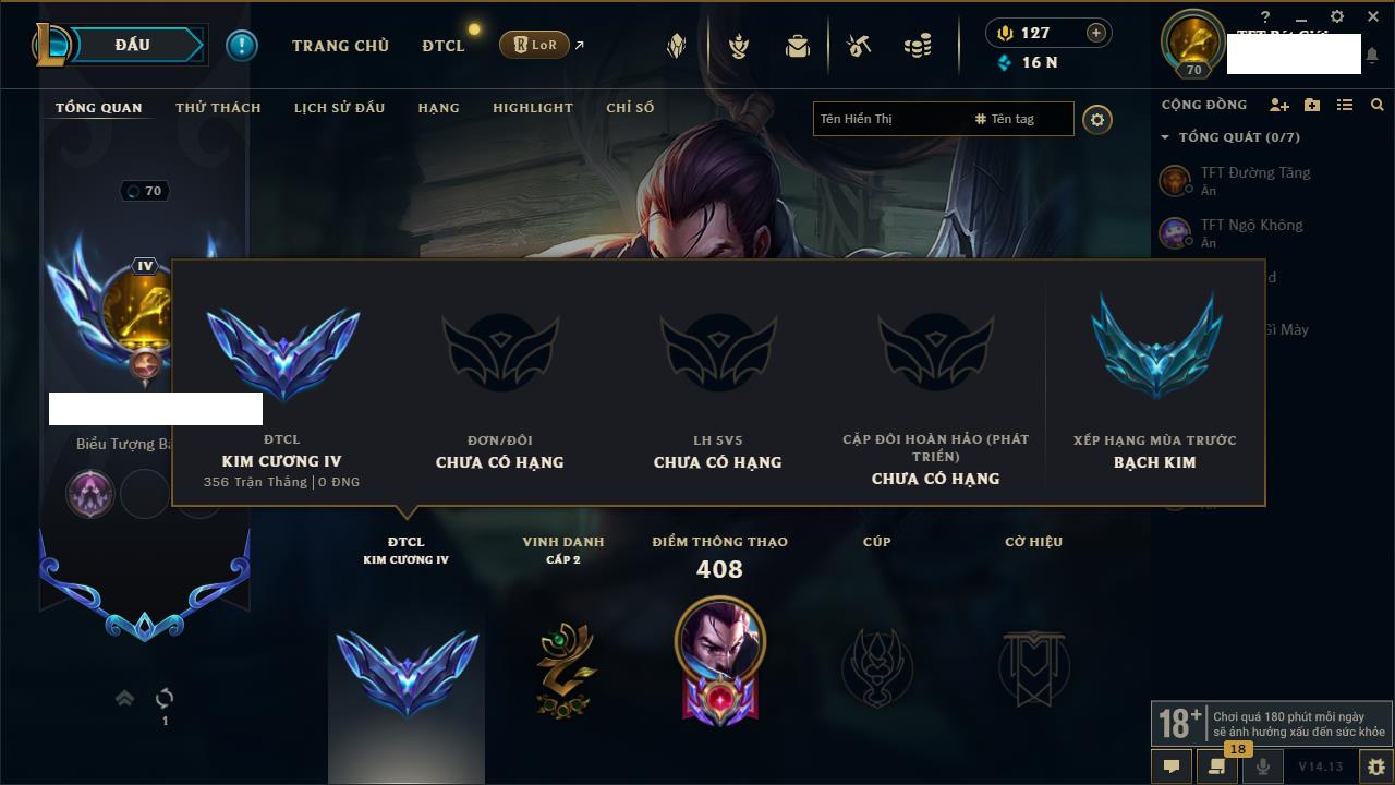 Rank Đơn: Chưa RankKhung: BạcTướng: 141 - Còn 299 THXTrang Phục: 101Rank ĐTCL: Chưa RankLinh Thú: 84