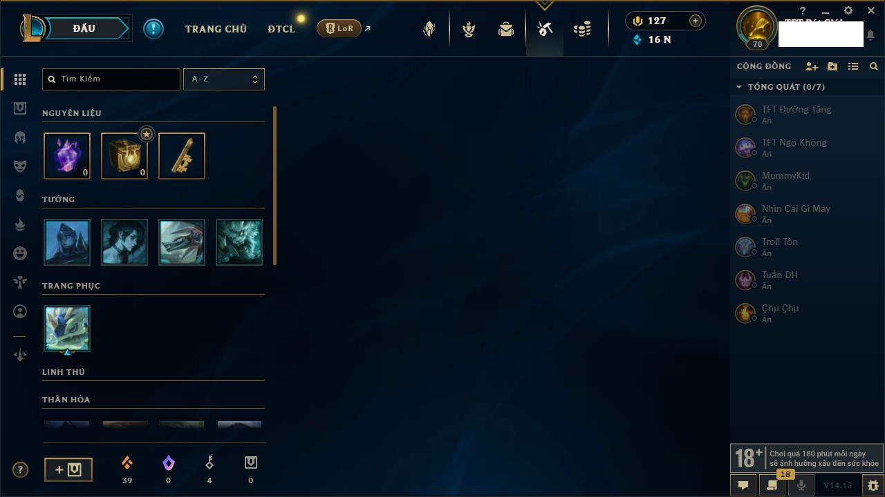 Rank Đơn: Chưa rank mùa nàoKhung: Chưa có khungTướng: 0 - Còn 2000 THXTrang Phục: 0Rank ĐTCL: Chưa RankLinh Thú: 14