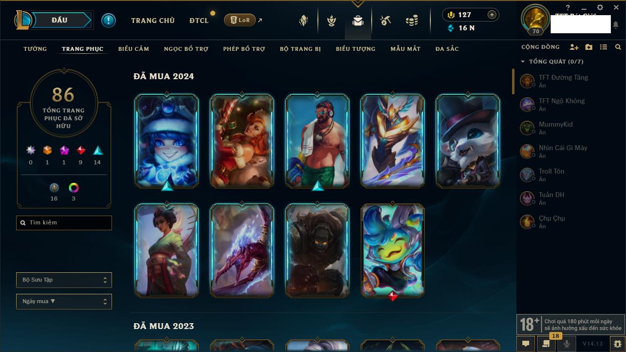Rank Đơn: Chưa RankKhung: Chưa có khungTướng: 163 - Còn 157403 THXTrang Phục: 149Rank ĐTCL: Chưa RankLinh Thú: 122