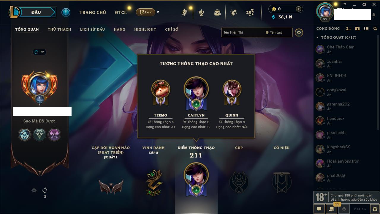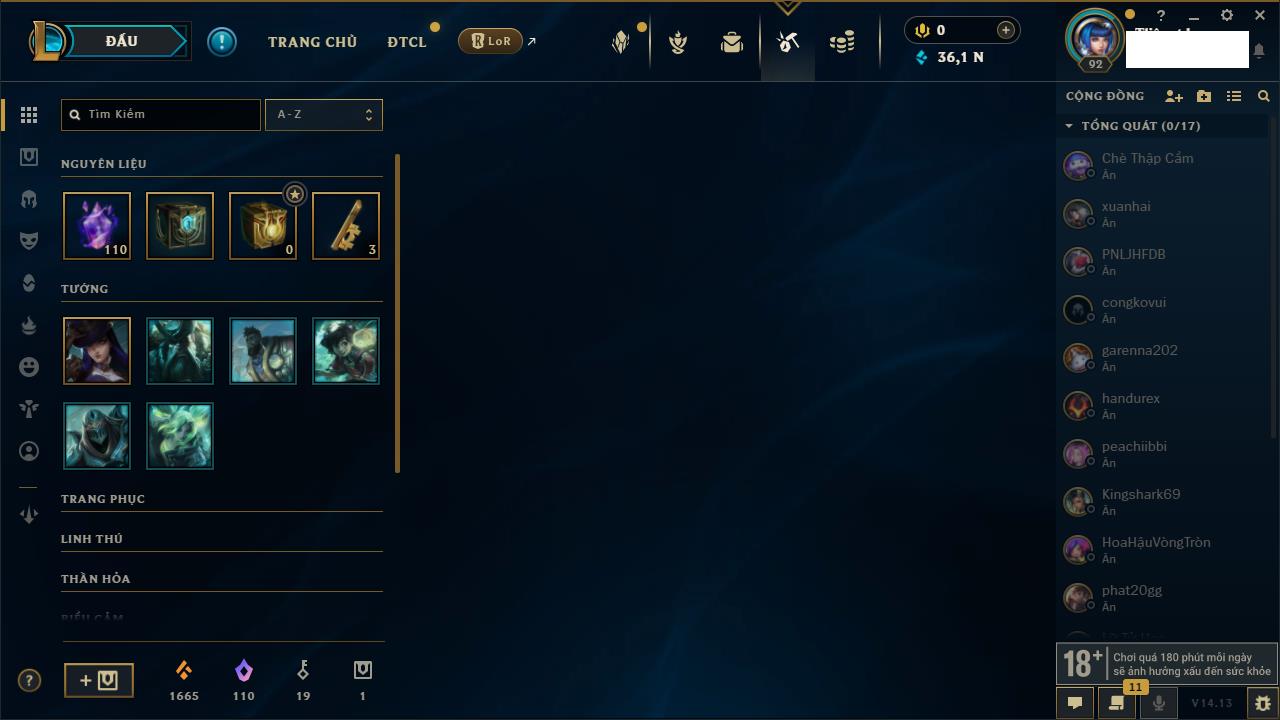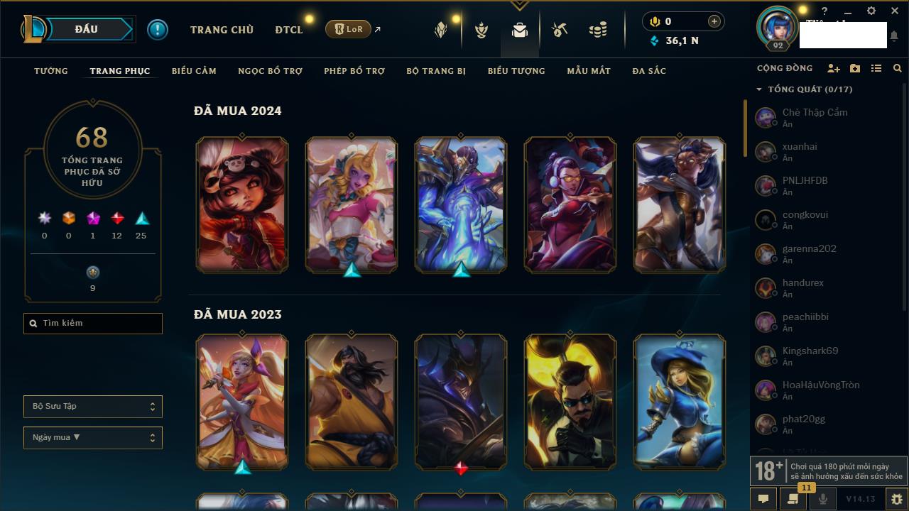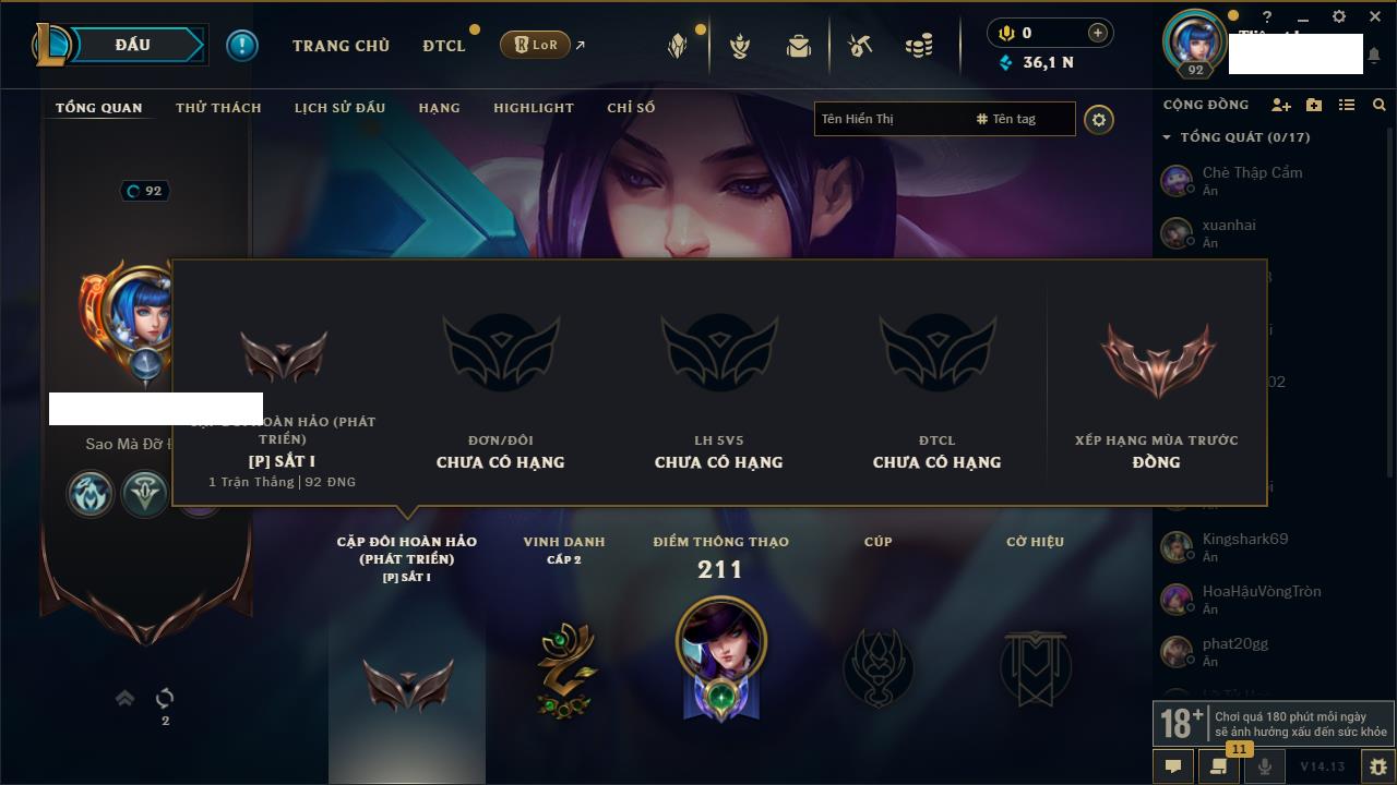 Rank Đơn: Đồng IIKhung: Chưa có khungTướng: 170 - Còn 56487 THXTrang Phục: 90Rank ĐTCL: Chưa RankLinh Thú: 129