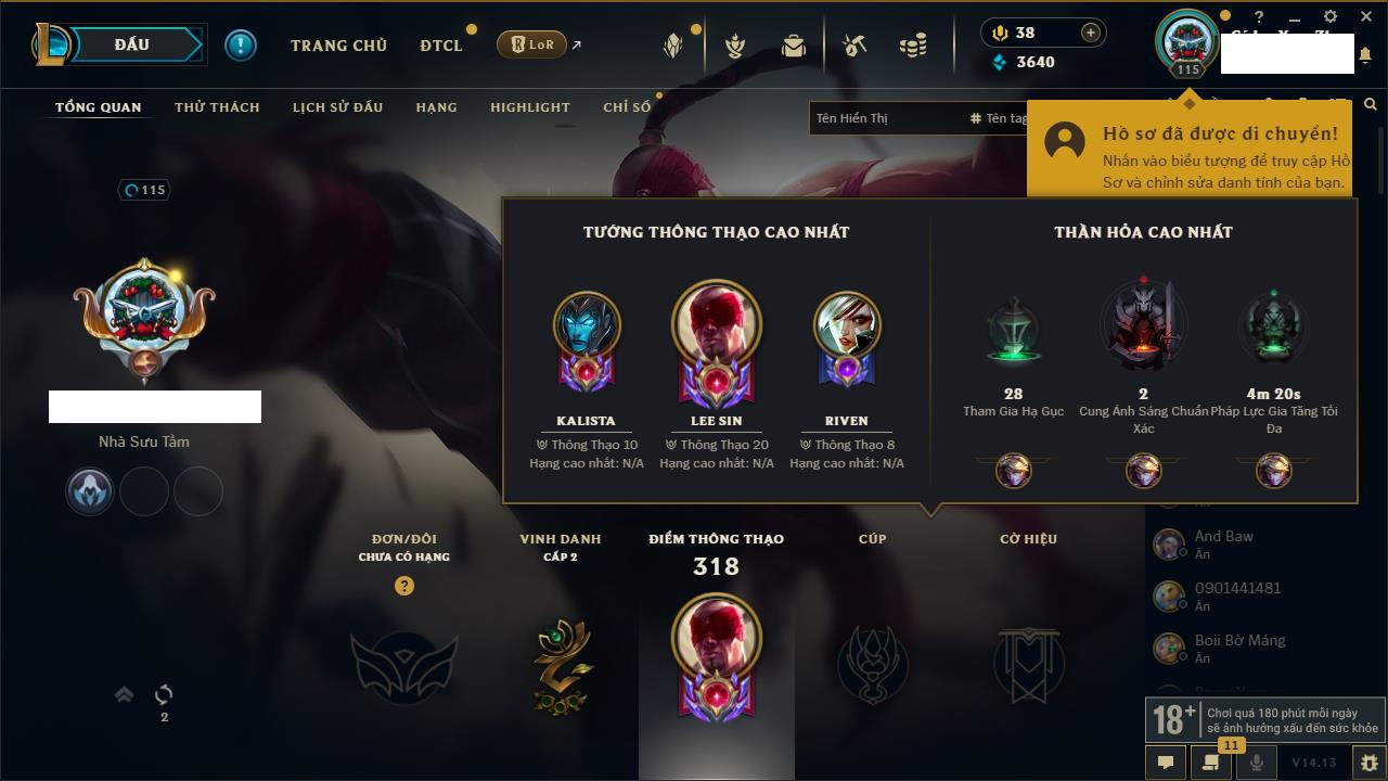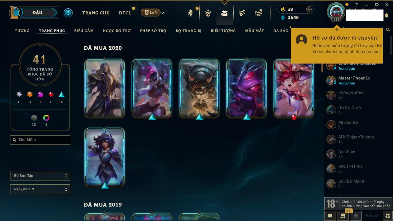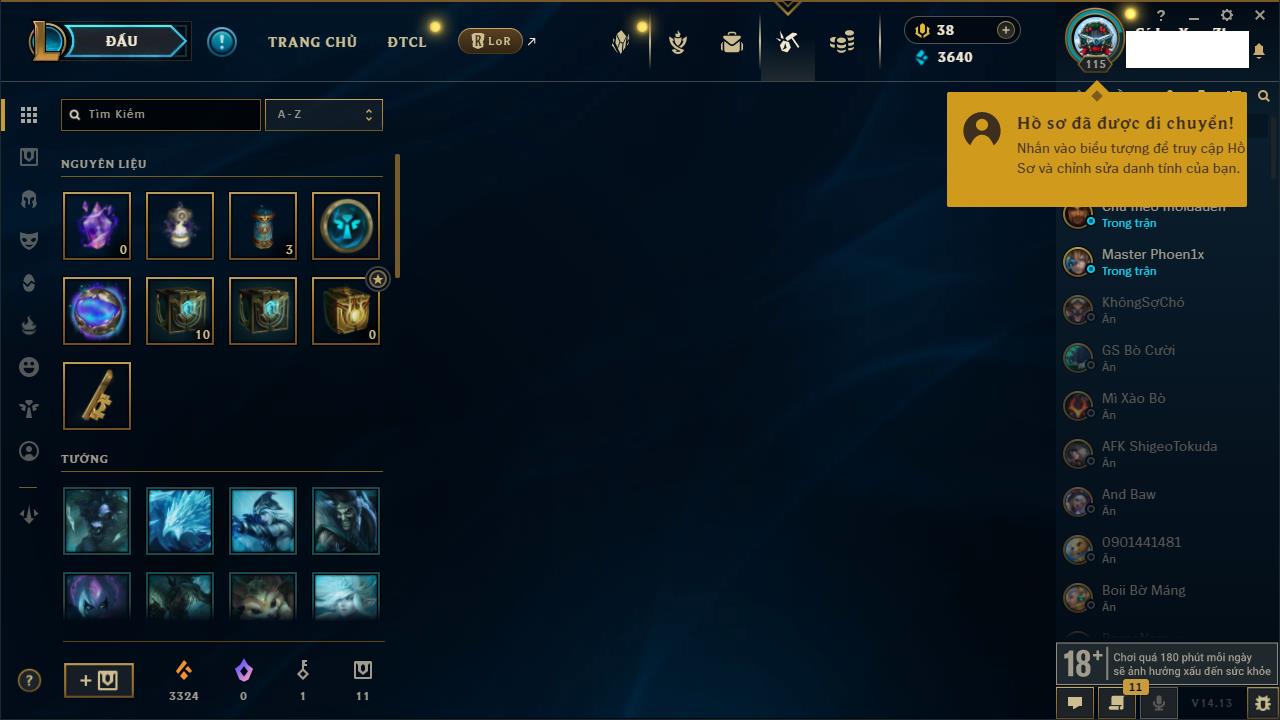 Rank Đơn: Bạc IVKhung: VàngTướng: 172 - Còn 358384 THXTrang Phục: 177Rank ĐTCL: Lục Bảo IILinh Thú: 211