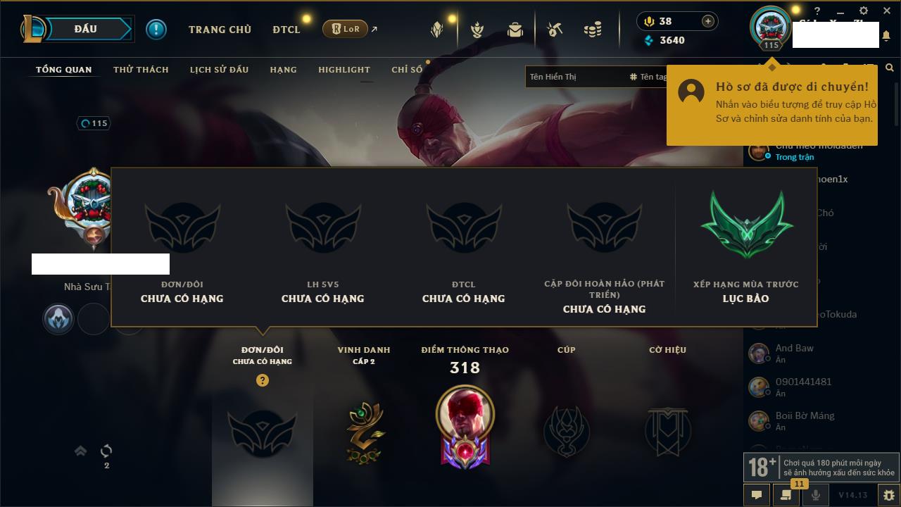 Rank Đơn: Vàng IVKhung: Chưa có khungTướng: 172 - Còn 55166 THXTrang Phục: 166Rank ĐTCL: Sắt IILinh Thú: 173
