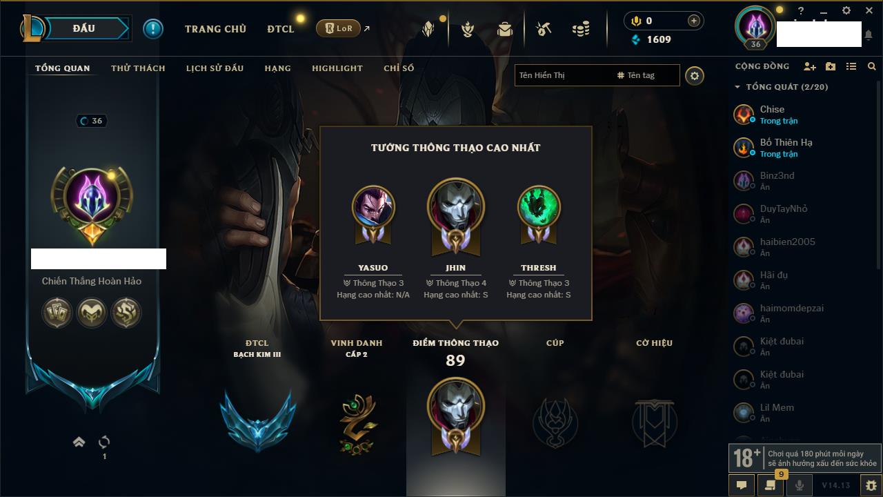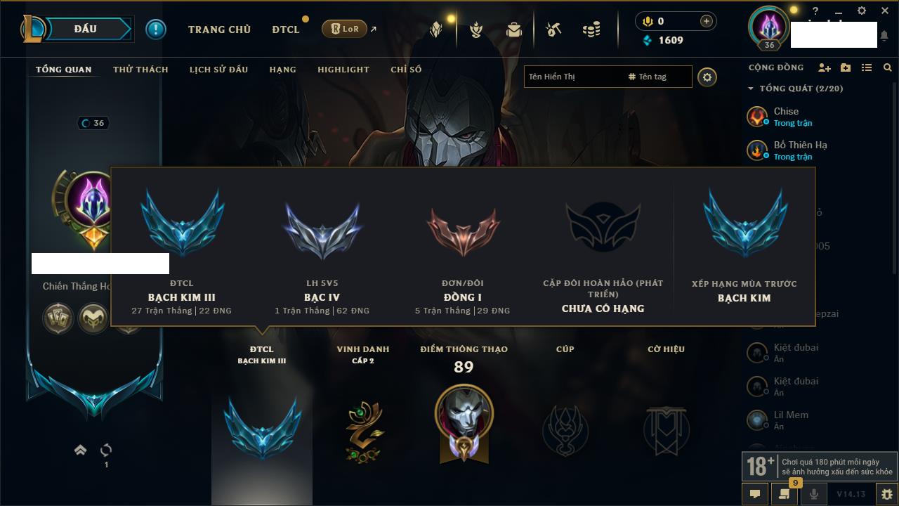 Rank Đơn: Bạc IIKhung: Bạch kimTướng: 169 - Còn 81813 THXTrang Phục: 301Rank ĐTCL: Chưa RankLinh Thú: 140