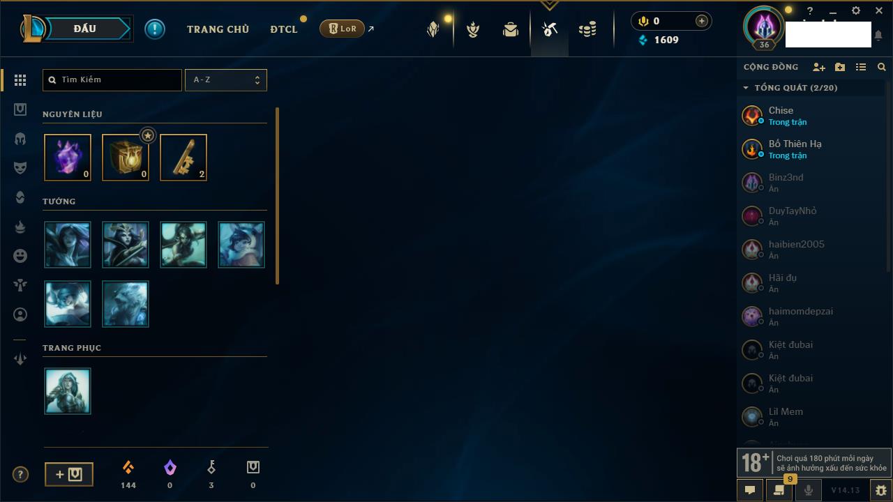 Rank Đơn: Sắt IVKhung: SắtTướng: 171 - Còn 231744 THXTrang Phục: 376Rank ĐTCL: Bạch Kim IILinh Thú: 120