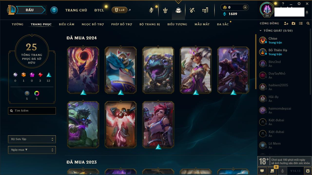 Rank Đơn: Chưa RankKhung: Chưa có khungTướng: 165 - Còn 1609 THXTrang Phục: 25Rank ĐTCL: Chưa RankLinh Thú: 44