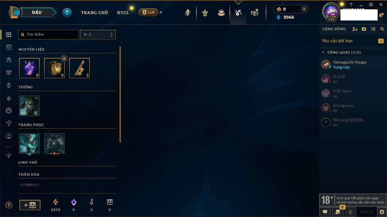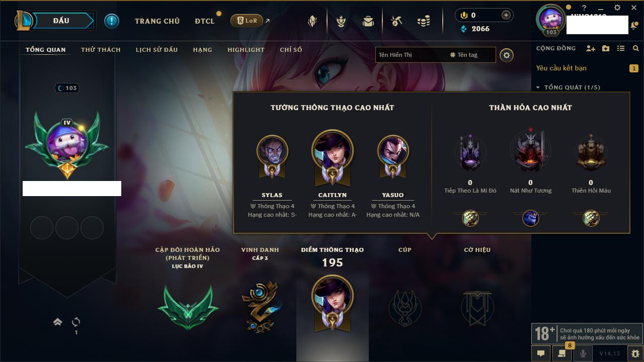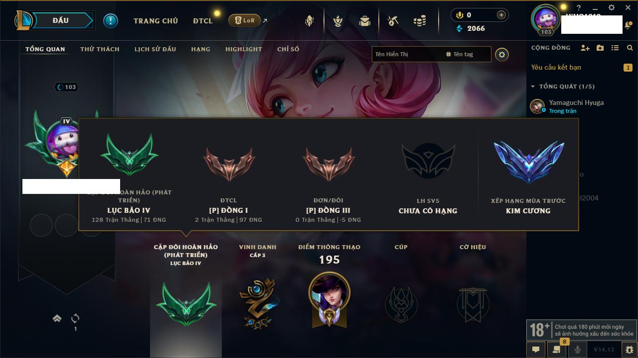 Rank Đơn: Lục Bảo IVKhung: VàngTướng: 171 - Còn 154648 THXTrang Phục: 203Rank ĐTCL: Bạch Kim IVLinh Thú: 69