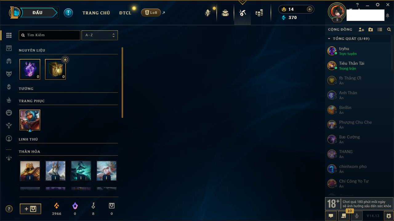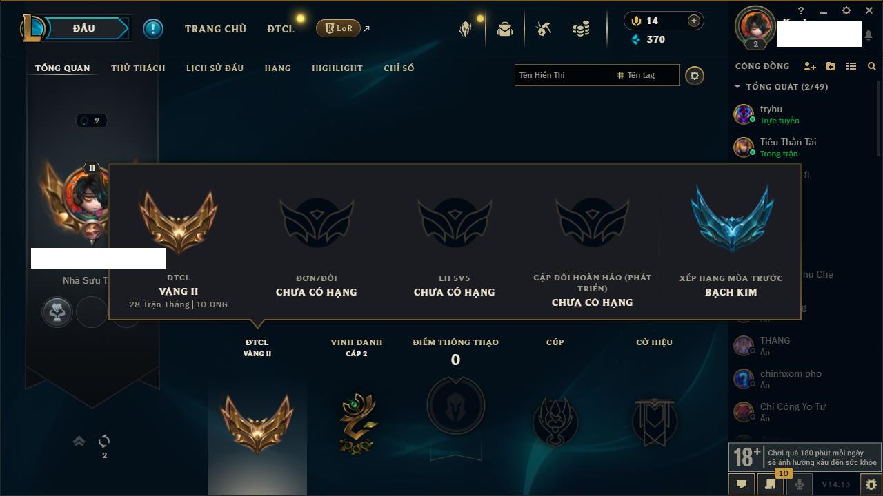 Rank Đơn: Chưa RankKhung: Chưa có khungTướng: 37 - Còn 27387 THXTrang Phục: 10Rank ĐTCL: Chưa RankLinh Thú: 1