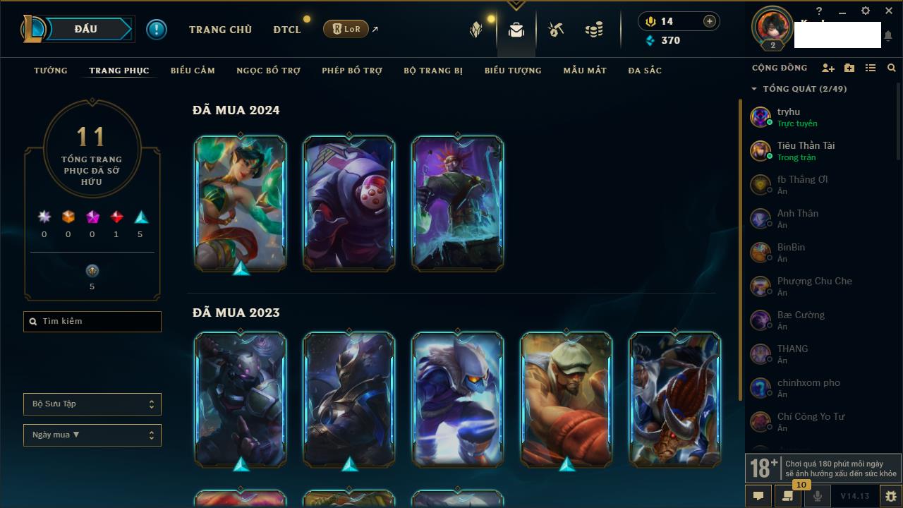 Rank Đơn: Chưa RankKhung: Chưa có khungTướng: 165 - Còn 3214 THXTrang Phục: 160Rank ĐTCL: Chưa RankLinh Thú: 28