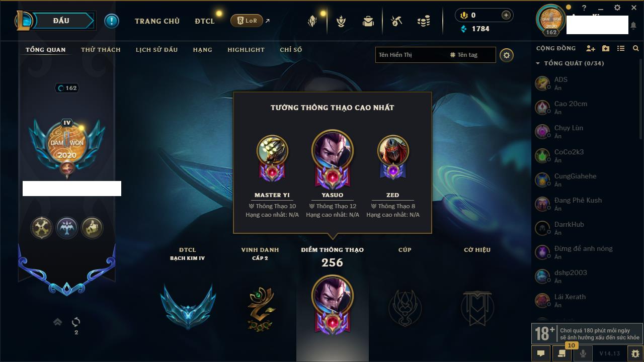 Rank Đơn: Chưa RankKhung: BạcTướng: 141 - Còn 299 THXTrang Phục: 101Rank ĐTCL: Chưa RankLinh Thú: 84