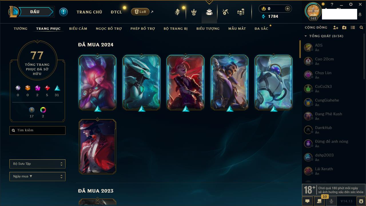 Rank Đơn: Chưa RankKhung: Chưa có khungTướng: 154 - Còn 18477 THXTrang Phục: 127Rank ĐTCL: Vàng ILinh Thú: 183