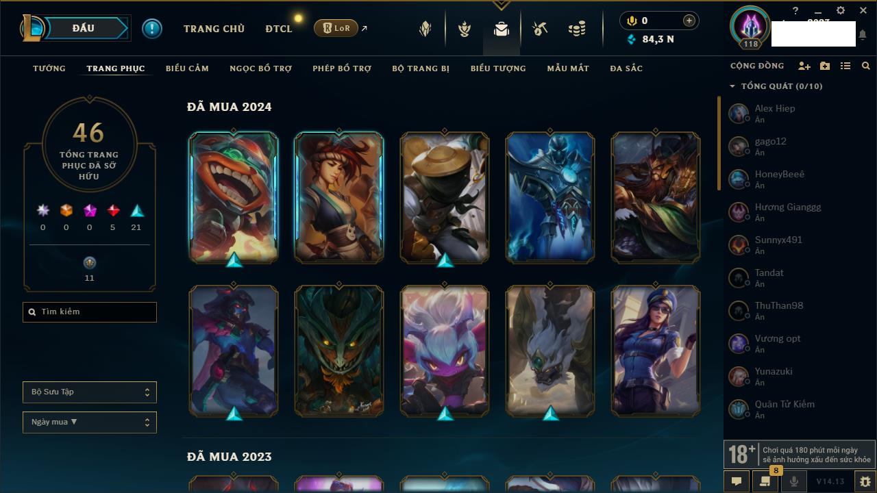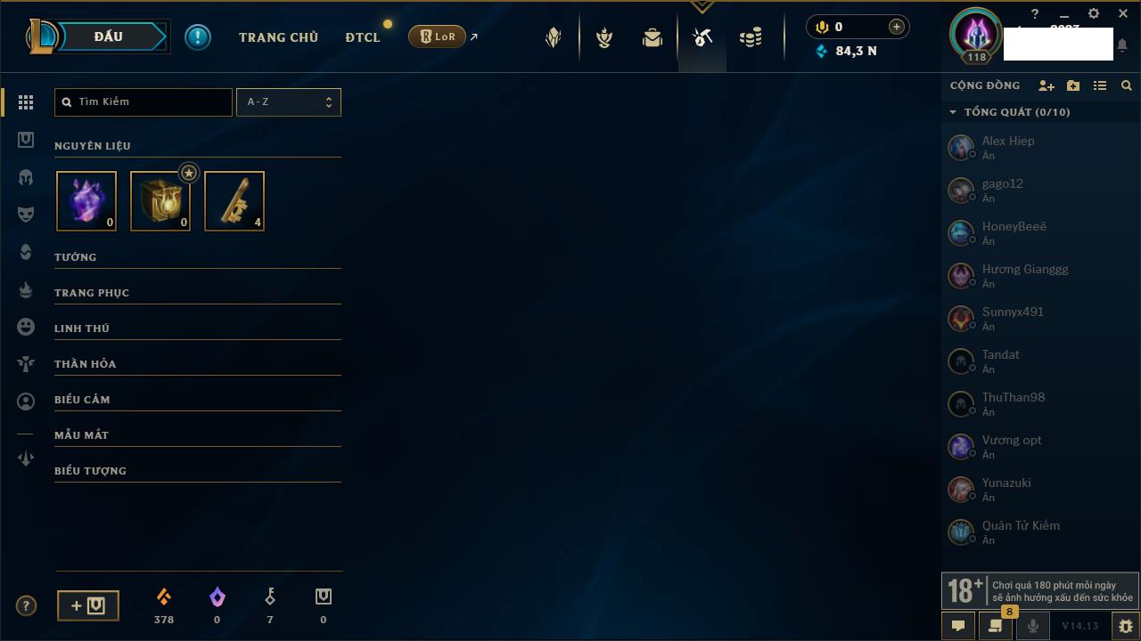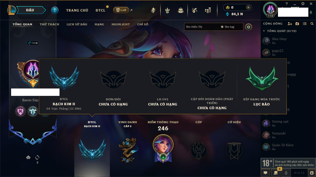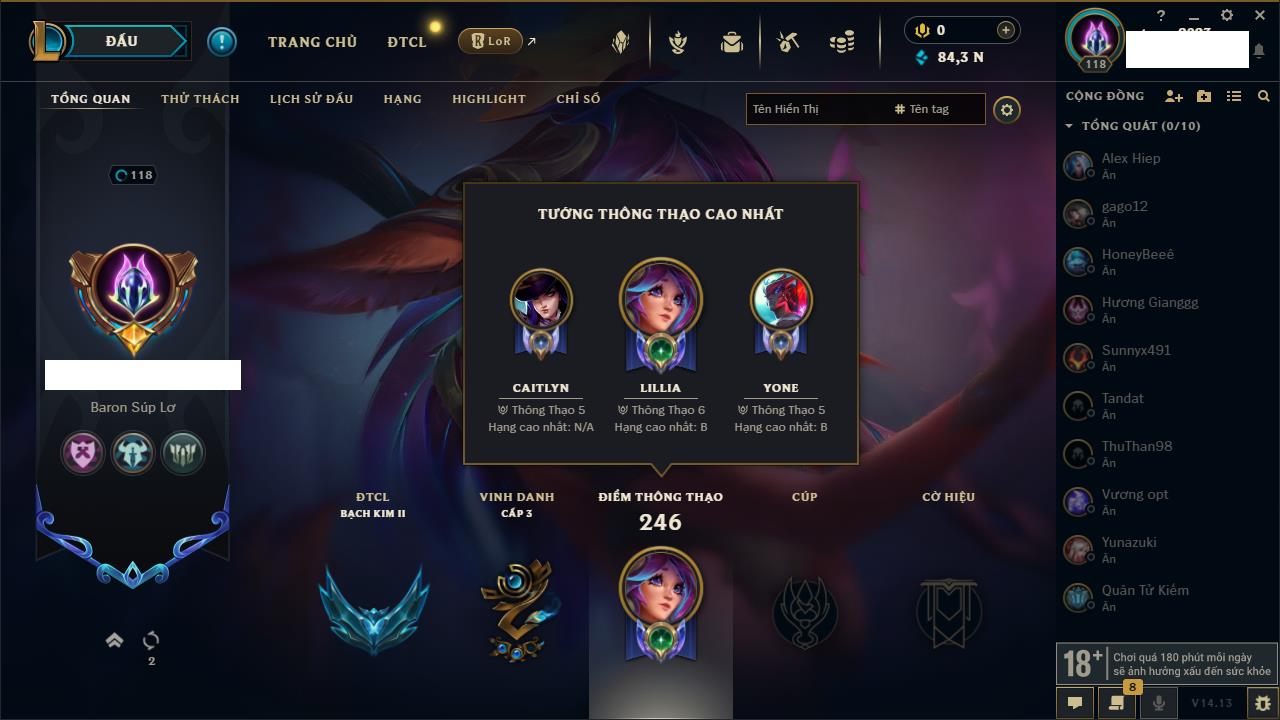 Rank Đơn: Bạc IVKhung: VàngTướng: 172 - Còn 358384 THXTrang Phục: 177Rank ĐTCL: Lục Bảo IILinh Thú: 211
