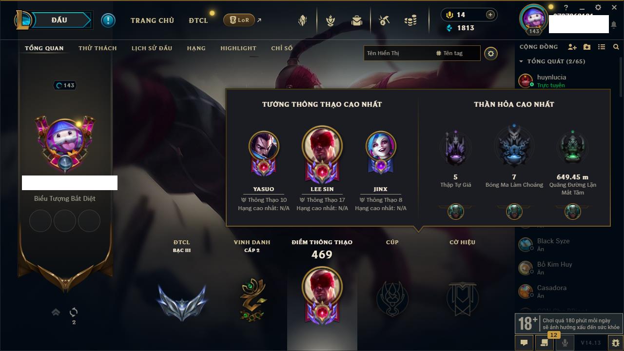 Rank Đơn: Bạch Kim IIKhung: Bạch kimTướng: 171 - Còn 316137 THXTrang Phục: 89Rank ĐTCL: Bạch Kim IIILinh Thú: 94