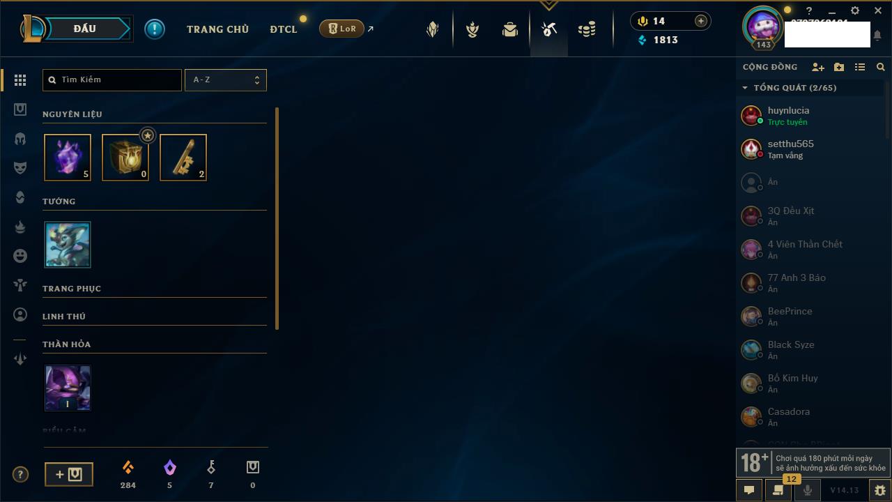 Rank Đơn: Lục Bảo IVKhung: VàngTướng: 171 - Còn 154648 THXTrang Phục: 203Rank ĐTCL: Bạch Kim IVLinh Thú: 69