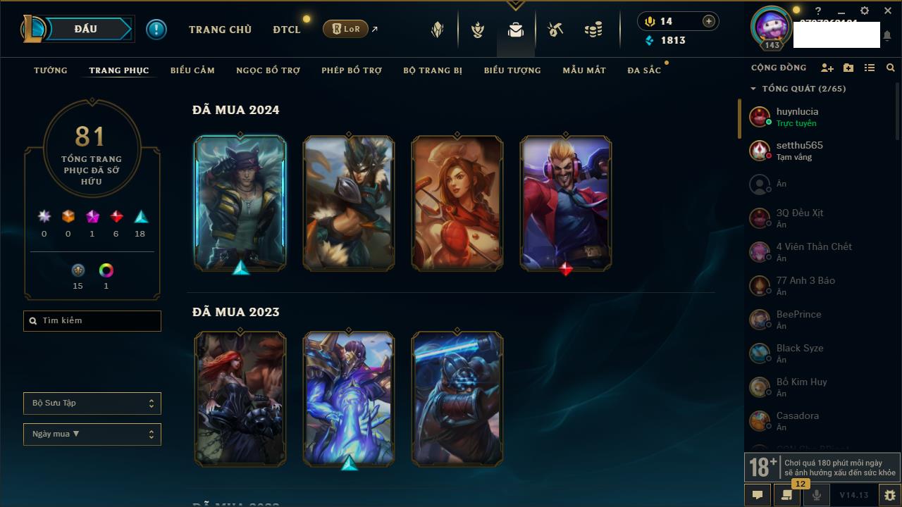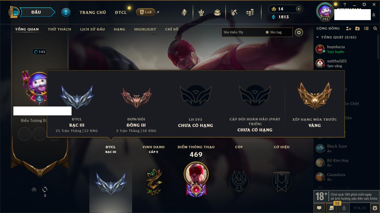Rank Đơn: Bạch Kim IIIKhung: Bạch kimTướng: 171 - Còn 136108 THXTrang Phục: 261Rank ĐTCL: Bạc IVLinh Thú: 73