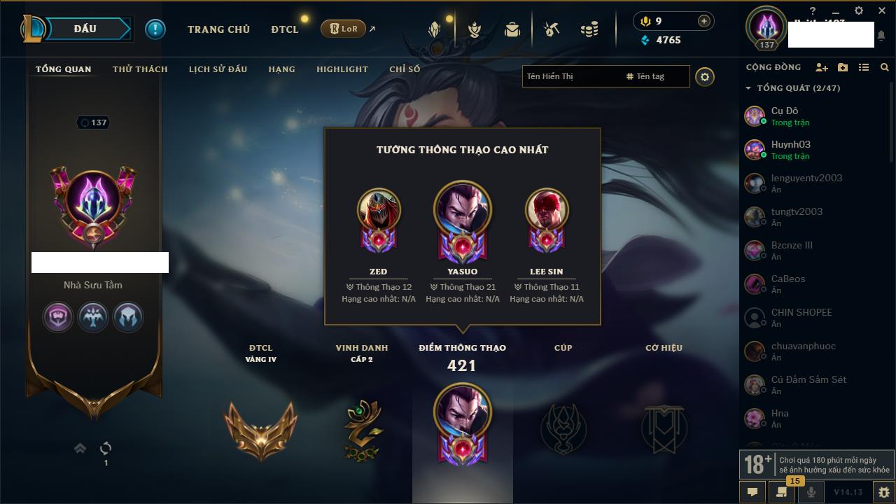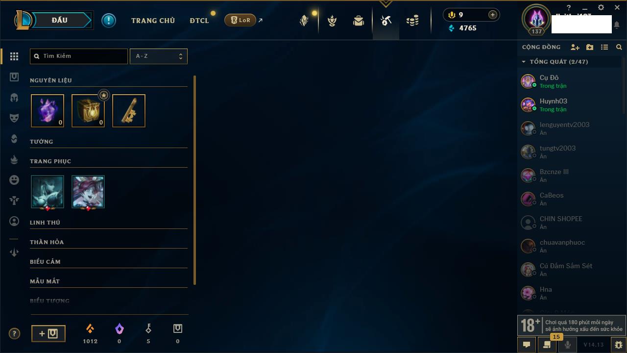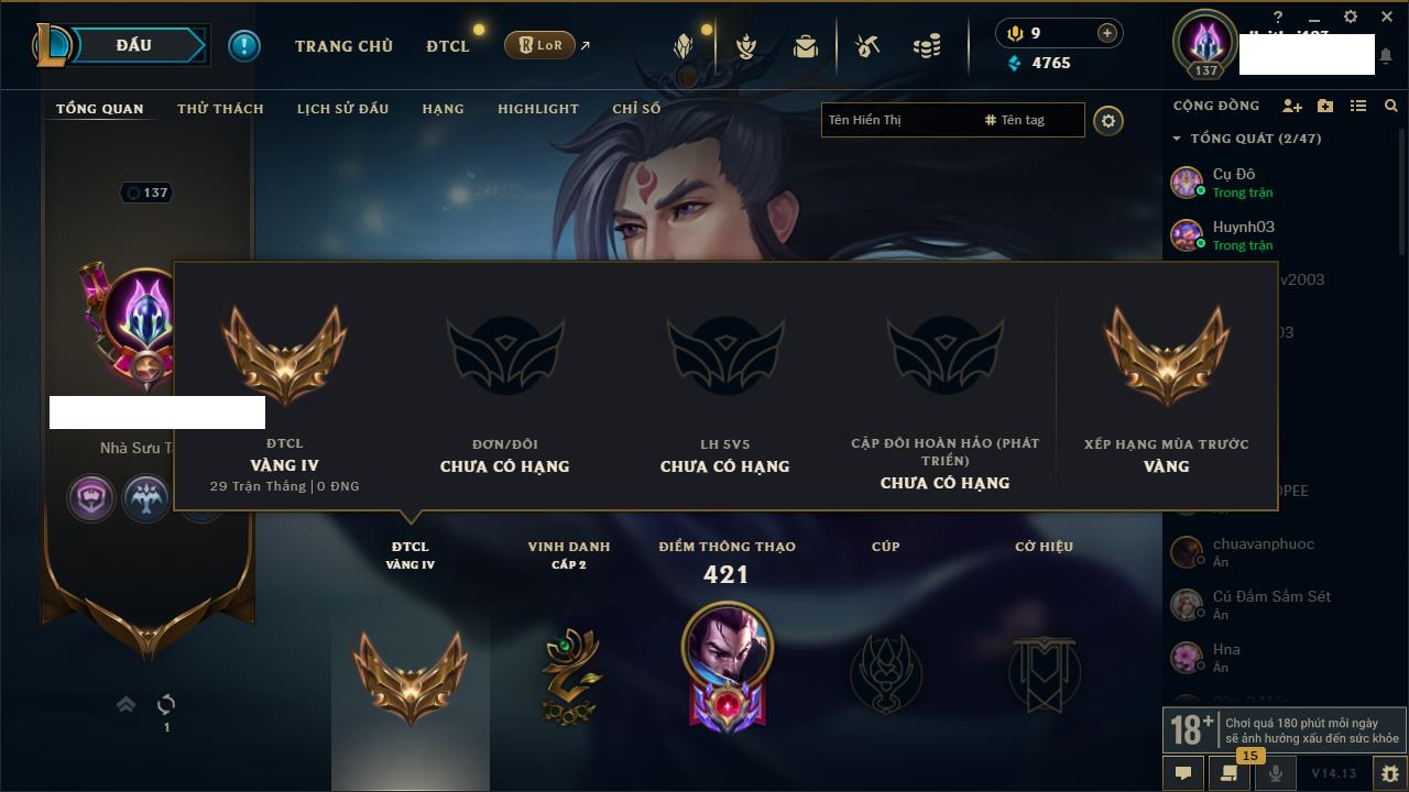 Rank Đơn: Vàng IVKhung: VàngTướng: 146 - Còn 89110 THXTrang Phục: 63Rank ĐTCL: Vàng IIILinh Thú: 41