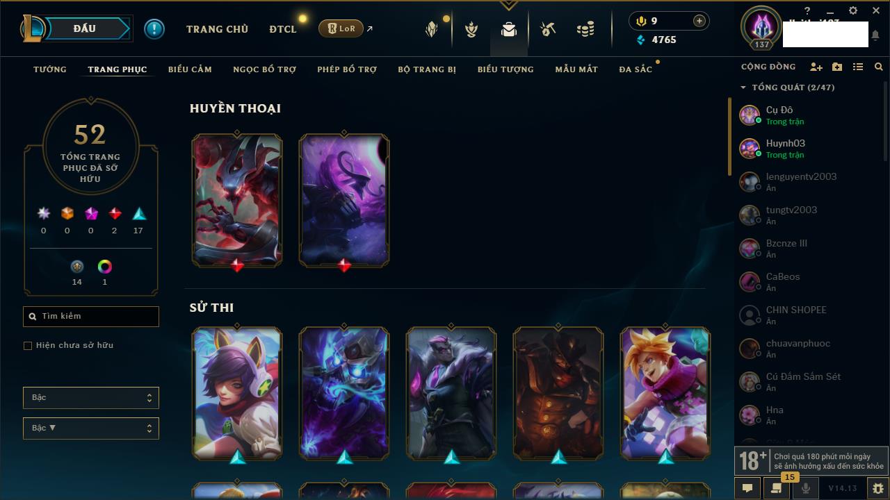 Rank Đơn: Vàng IIIKhung: VàngTướng: 170 - Còn 33222 THXTrang Phục: 136Rank ĐTCL: Chưa RankLinh Thú: 40