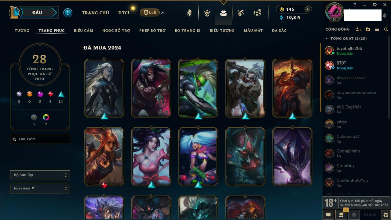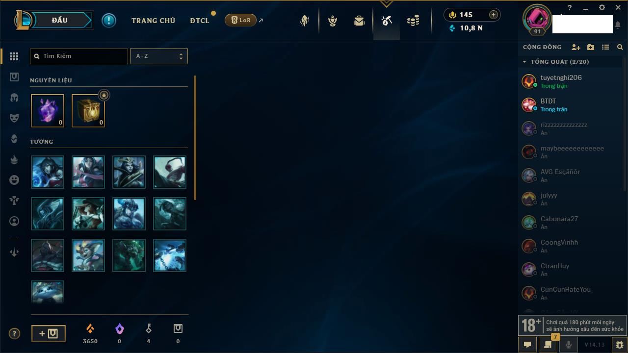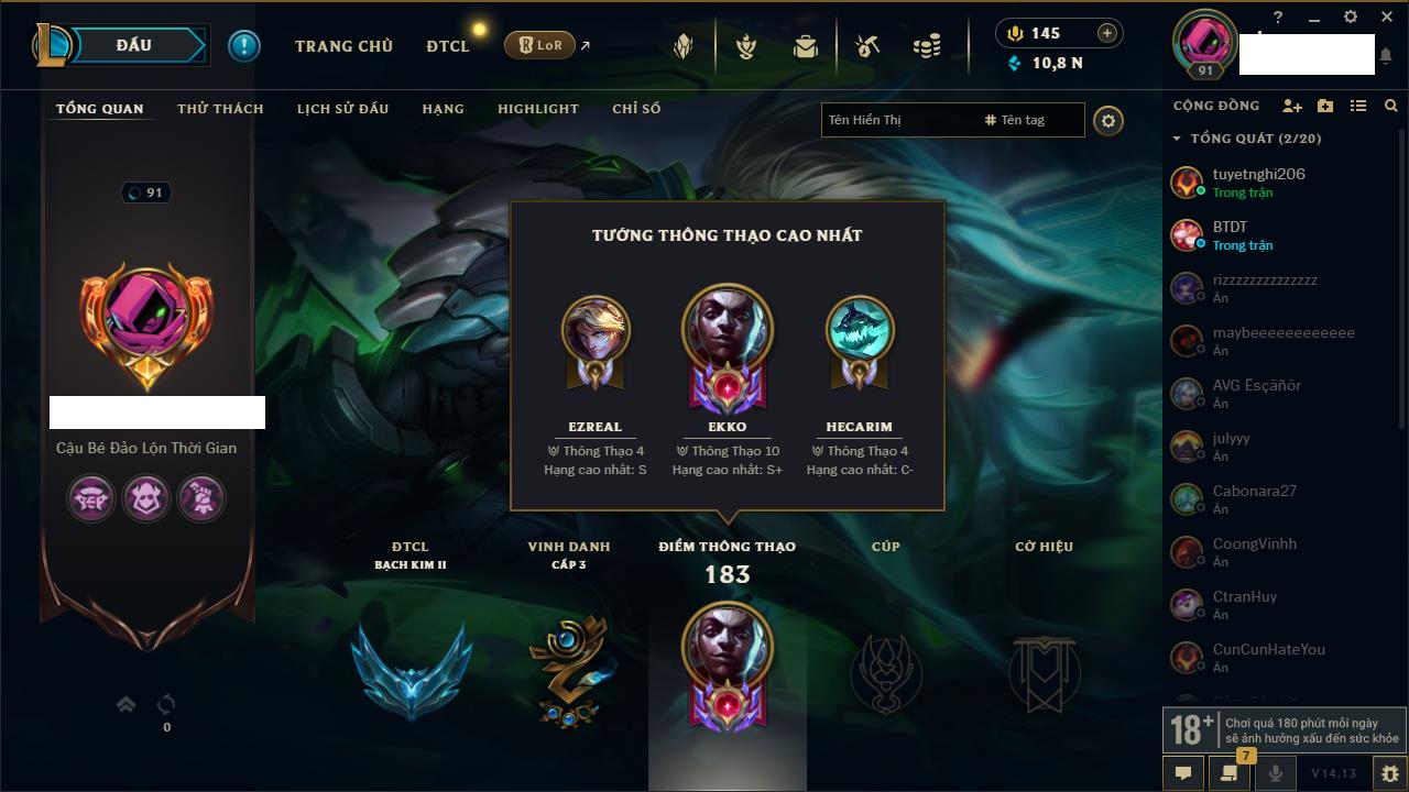 Rank Đơn: Chưa rank mùa nàoKhung: Chưa có khungTướng: 10 - Còn 21800 THXTrang Phục: 0Rank ĐTCL: Bạc ILinh Thú: 33